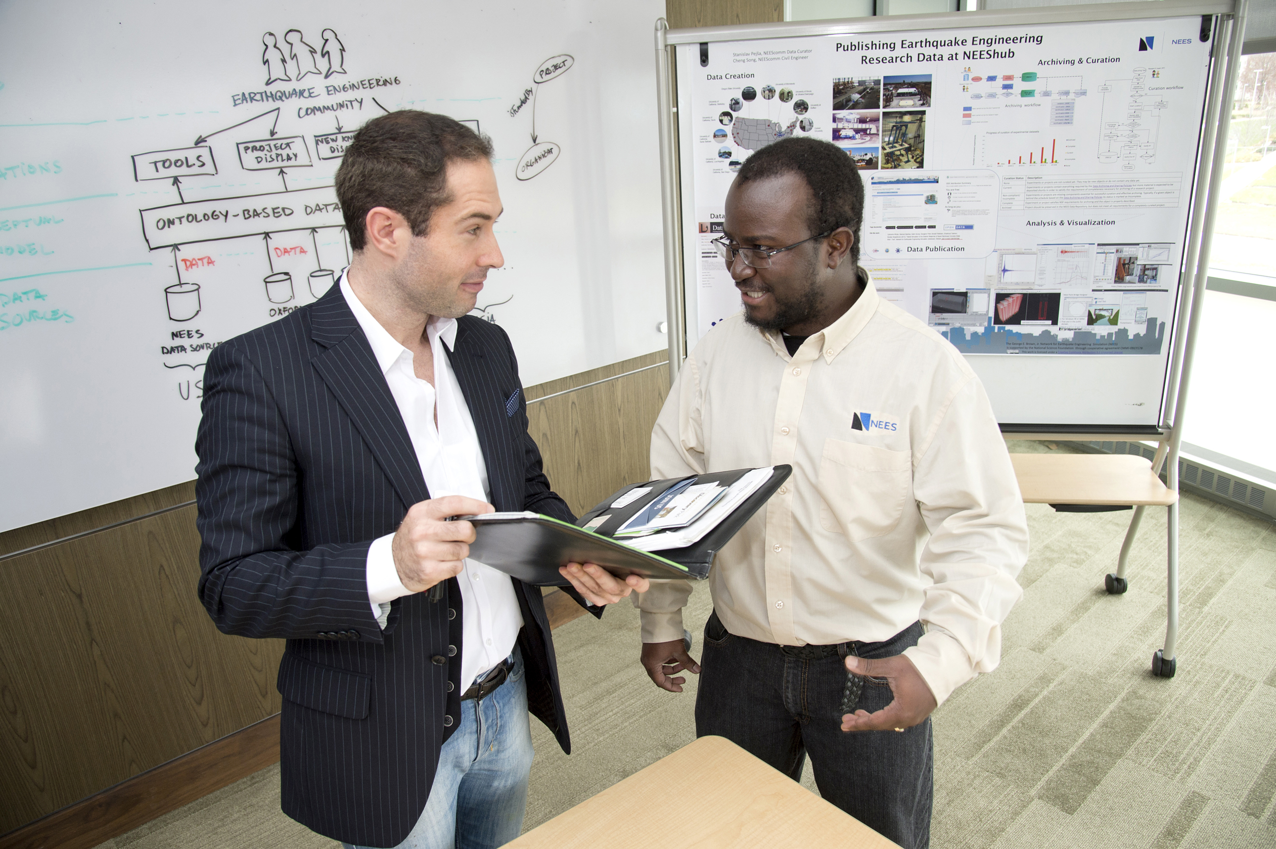 Ignacio Lamata Martinez, left, a researcher at the University of Oxford in England, and Gemez Marshall, senior software engineer for NEEScomm IT at Purdue, discuss efforts of the team at the George E. Brown Jr. Network for Earthquake Engineering Simulation to develop a system for integration of shared experimental data for global use. (Purdue University photo/Mark Simons).