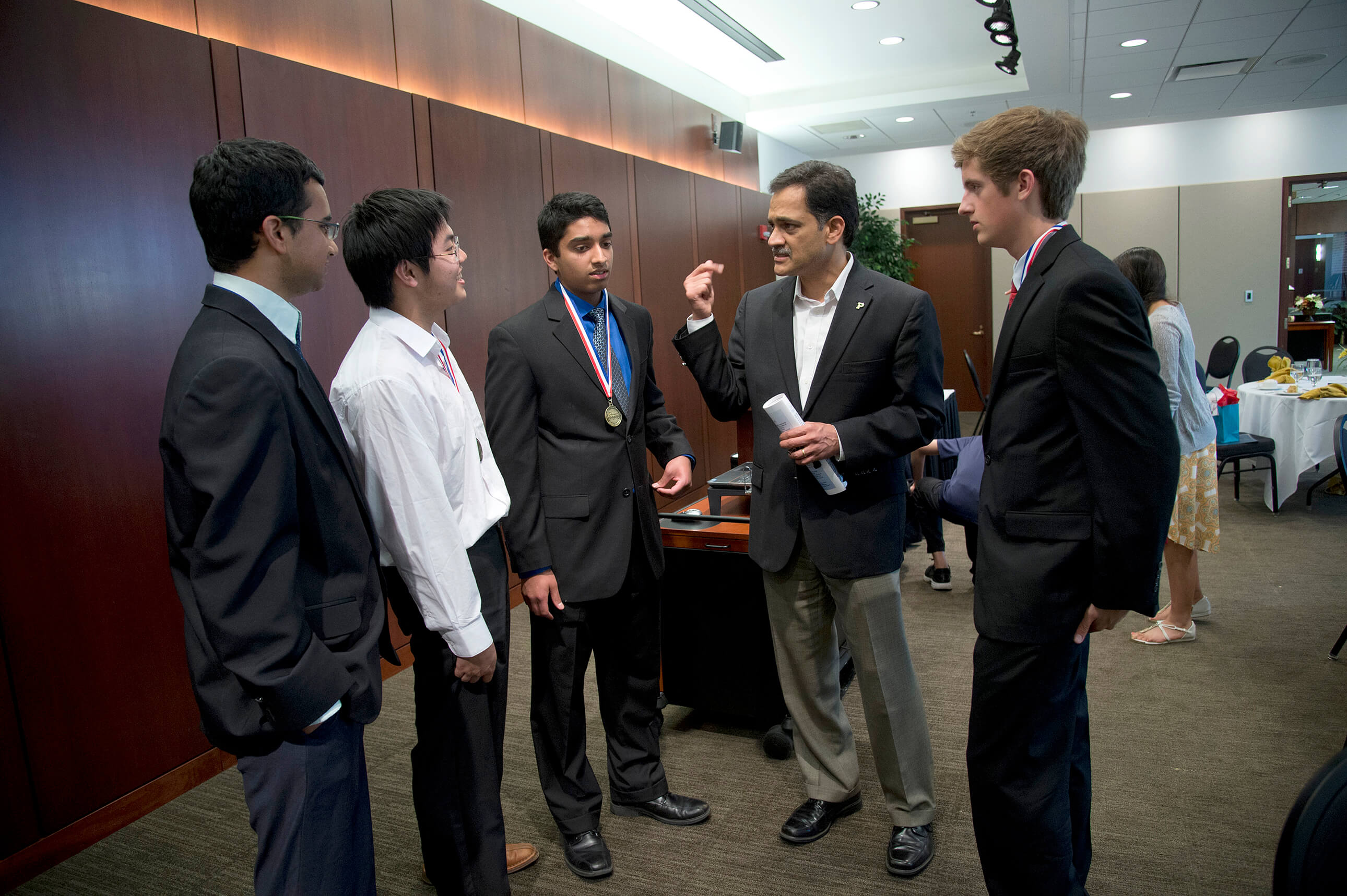 Members of Team USA 2014, selected by the Center for Excellence in Education (CEE) during the USA Biology Olympiad, visit with Suresh Garimella, executive vice president for research and partnerships at Purdue University, during the awards ceremony at Purdue's Dauch Alumni Center on June 12. From left are Abhijit Mudigonda of Oregon, Yilun Du of Washington, Varun Mangalick of Minnesota, Garimella and William Long of Virginia. (Purdue University photo/Mark Simons)
