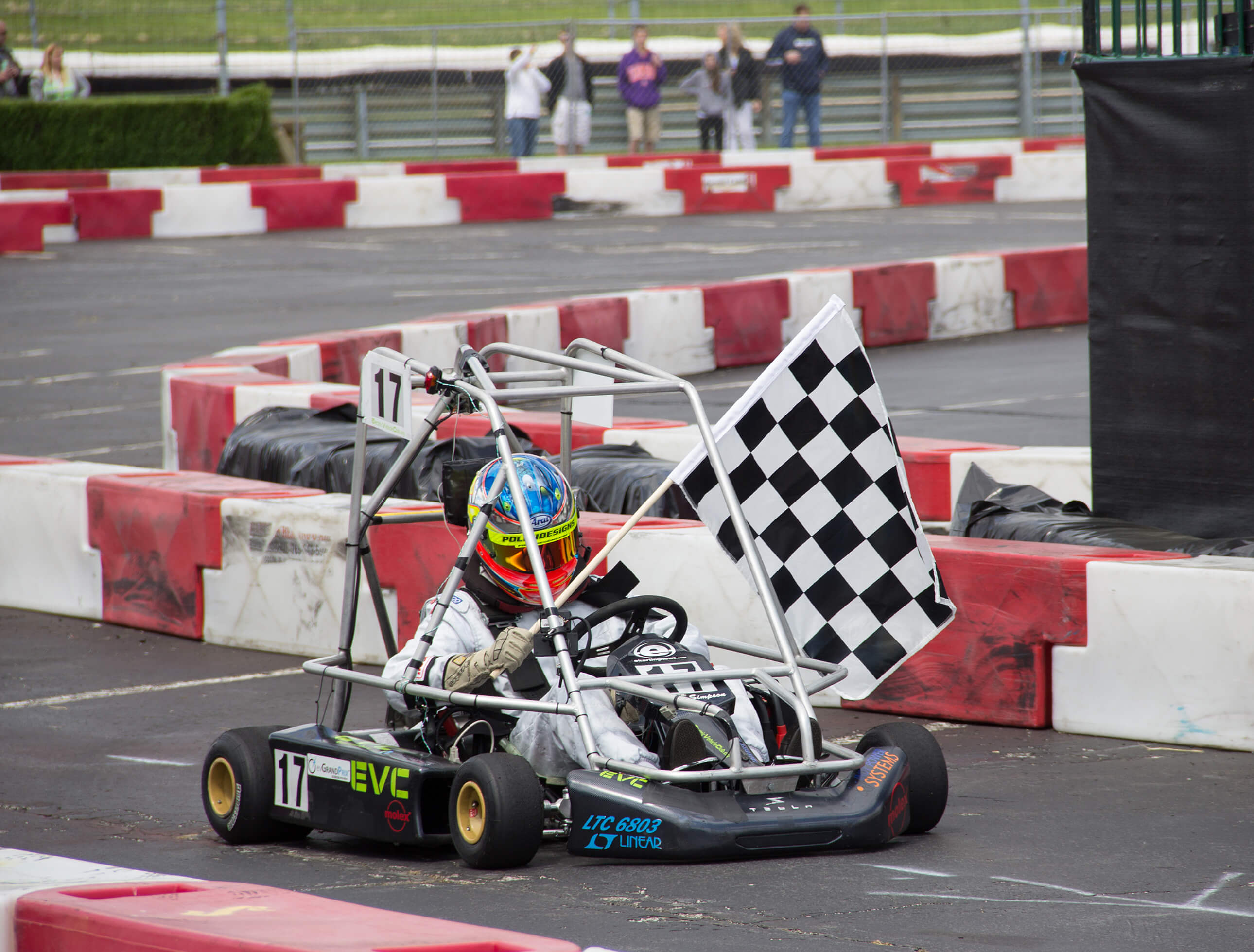Jimmy Simpson waves the checkered flag after winning the 2013 Purdue International evGrandPrix. (Photo contributed)
