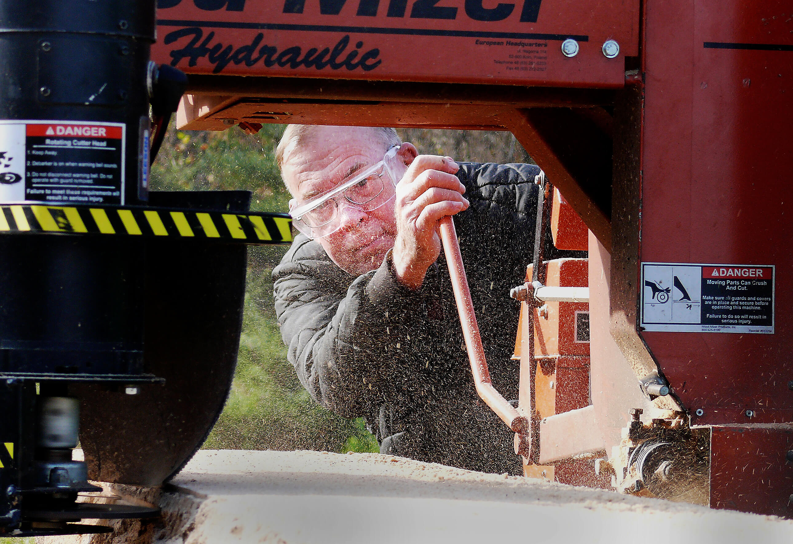 Dan Cassens, a Purdue professor of wood products, cuts a piece of lumber from a log using a horizontal thin kerf band mill. (Purdue Agricultural Communication photo/Keith Robinson) |
