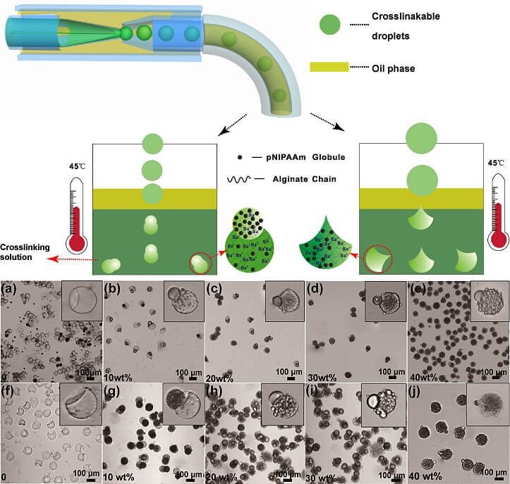 A mixture of sodium alginate and polyNIPAAm is formed into uniform droplets using microfluidics, a technology for controlling minute micro-quantities of fluids with tiny tubes and channels. The droplets are injected into a "collecting solution" containing glycerol and barium acetate. Barium ions diffuse into the resulting droplets, causing them to "crosslink," or reinforce with chemical bonds, and jellify into squishy mushroom-shaped microgel particles. The particles can be induced to deform into different shapes by varying the concentration of glycerol in the collecting solution; microgels also can "phase separate," producing Janus particles.