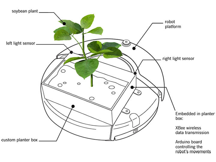 “Soybots: Mobile Micro-Gardens is a responsive robotic-botanic hybrid artwork that utilizes light sensors to track sunlight intensity or to locate LED grow lights,” said Shannon McMullen, an assistant professor of electronic and time-based art. “We chose soybean plants because they are a key global food source, and part of producing art is to raise questions about the future of robotics in agriculture and how humans exist in this relationship.”