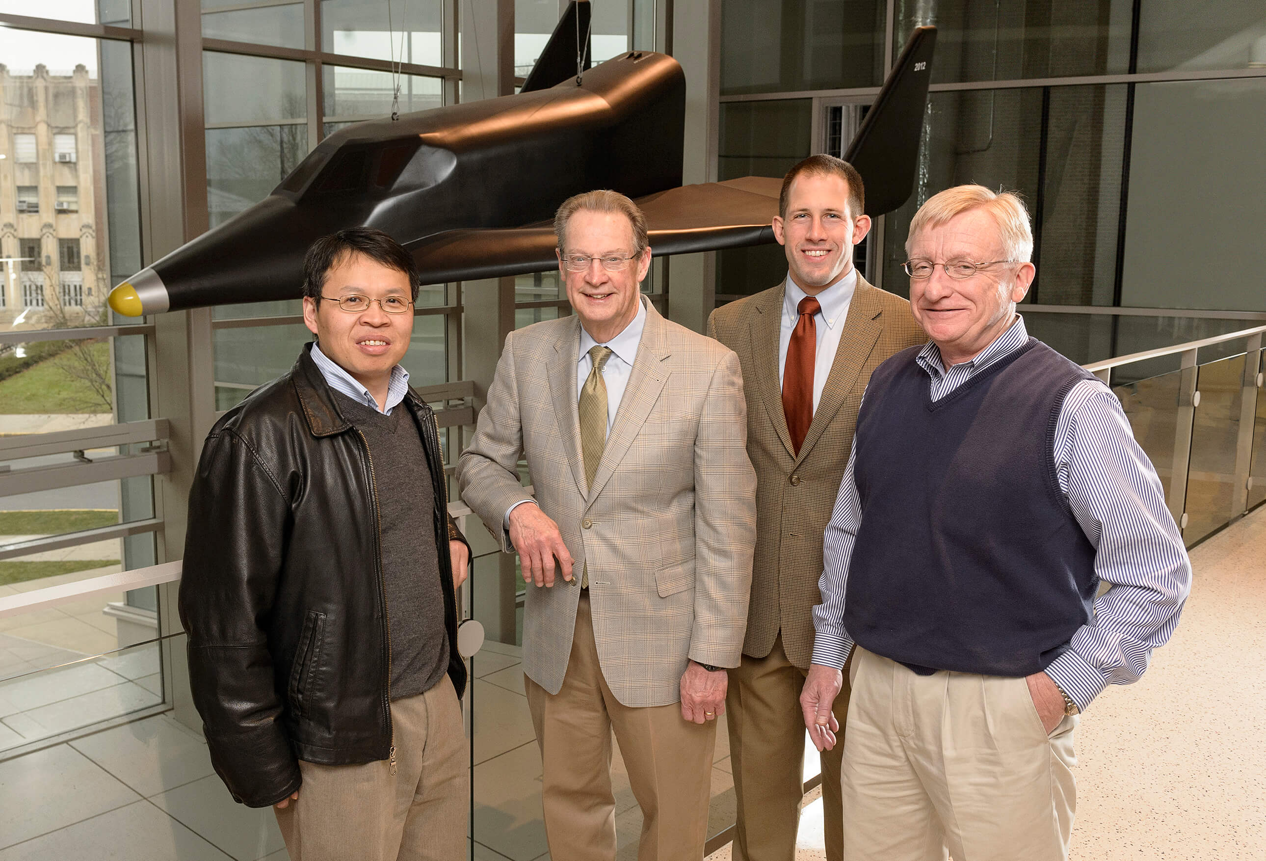 The multistate Institute for Advanced Composites Manufacturing Innovation (IACMI) includes the Indiana-based Design, Modeling & Simulation Enabling Technology Center, which is led by R. Byron Pipes, the John Leighton Bray Distinguished Professor of Engineering at Purdue, along with a consortium of university researchers, manufacturers, national laboratories, and state and local government agencies. Team leaders at Purdue, from left, are Wenbin Yu, associate professor of aeronautics and astronautics; Pipes; Johnathan Goodsell, visiting assistant professor of aeronautics and astronautics; and Ronald Steuterman, the center’s managing director. (Purdue University photo/John Underwood)