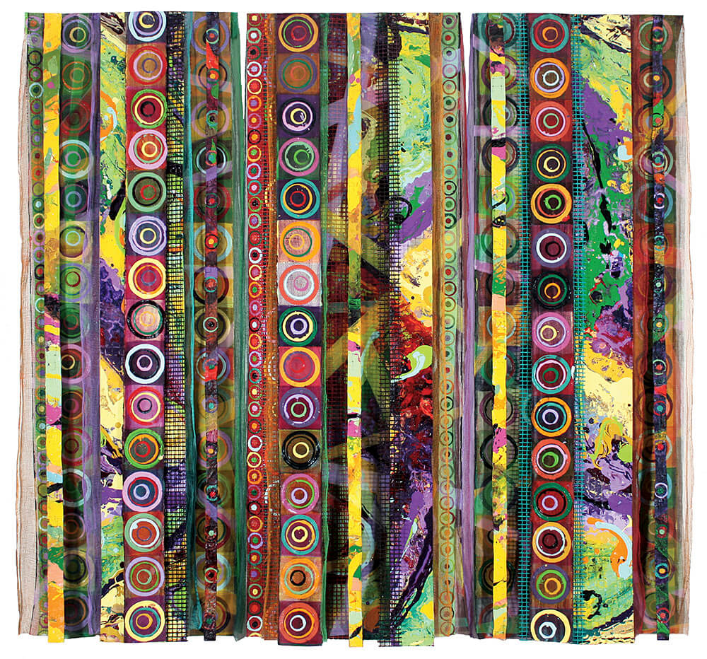 Works range from delicate illusions to layered constructions to architectural interventions. Mixed media includes oil and acrylic paint, vintage clothing, aluminum screens, wool, silk, plastic, thread, vinyl, burlap, rug-hold, glass, recycled objects and found fabrics. Whether painting, tapestry or construct, these works interweave sensory pleasure with repetitive process to invoke introspection and reflection.