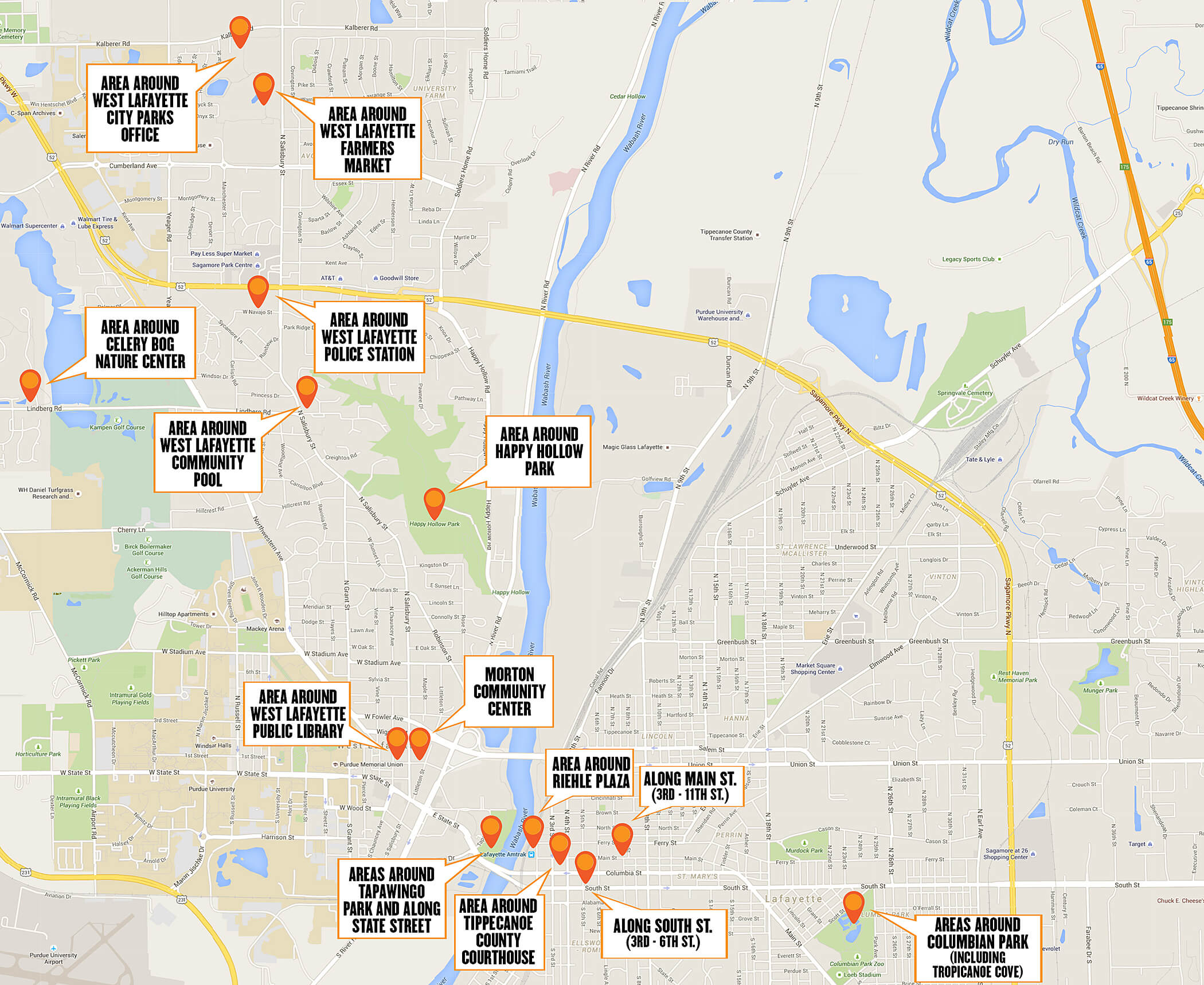 In Lafayette, Purdue Wi-Fi will now be available surrounding the Tippecanoe County Courthouse square, Tippecanoe County Public Library, CityBus downtown transfer station and Columbian Park (shelters along Park Avenue, the SIA playground, Memorial Island, Zoo, Loeb Stadium press box area and Tropicanoe Cove). In West Lafayette, Purdue Wi-Fi will be available at the West Lafayette Public Library, West Lafayette Police Department, Tapawingo Park, West Lafayette City Pool, Celery Bog Nature Center, Morton Community Center, West Lafayette Parks Office (near Kalberer Road and Salisbury Street) and the Farmers Market on North Salisbury Street.