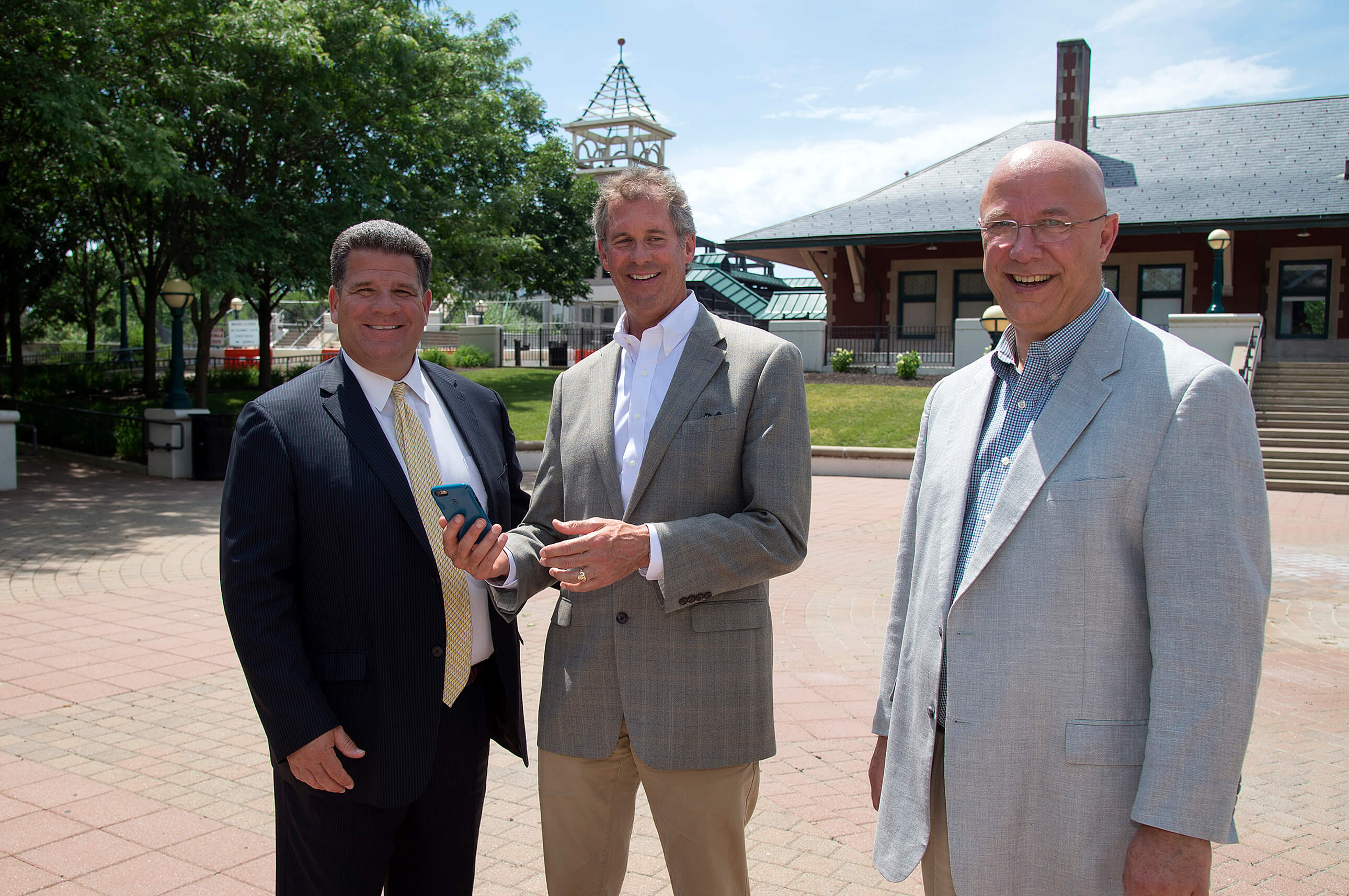 Purdue System Chief Information Officer Gerry McCartney (right) meets with Lafayette Mayor Tony Roswarski and West Lafayette Mayor John Dennis at the Riehle Plaza Depot to announce the expansion of Purdue's wireless network into several outdoor locations in Lafayette and West Lafayette. (Purdue News Service photo/Mark Simons) |