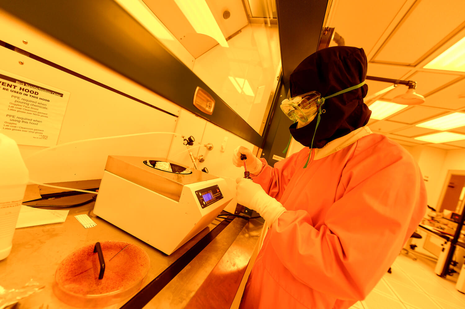 The Birck cleanroom provides the particle-free environment needed for fabricating microscale and nanoscale devices, as well as the biological-pharmaceutical-grade environment needed for work with pathogen-detecting biochips and other biological nanotechnology. To maintain the high level of cleanliness, researchers must wear specialized jumpsuits, hoods, face-veils, gloves, and shoe coverings, and pass through air showers before entering.