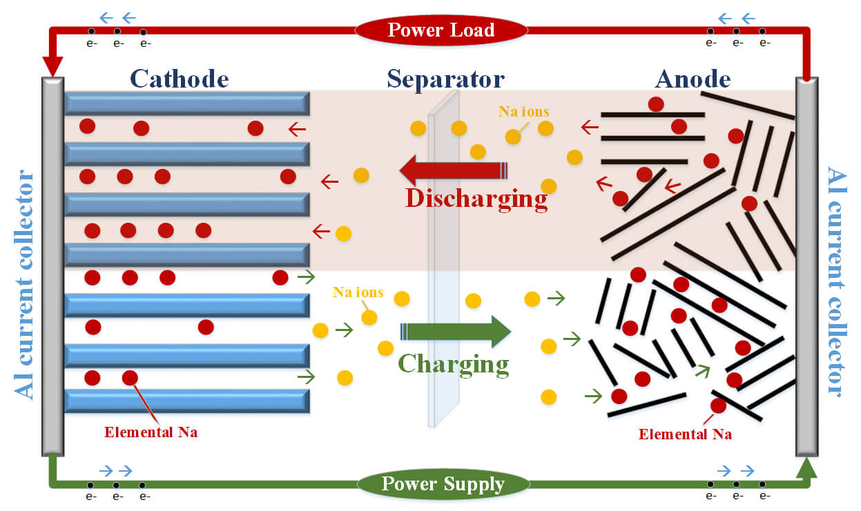 Batteries have two electrodes, called an anode and a cathode. The anodes in most of today's lithium-ion batteries are made of thin layers of stacked graphene called graphite. In lithium-ion batteries, lithium ions can easily fit between graphene layers due to their small size. In sodium-ion batteries, sodium ions cannot pass between the graphitic layers reversibly due to their larger size and bulkier nature. The sodium ions go inside the graphitic layers during charging but do not come back during discharging process.