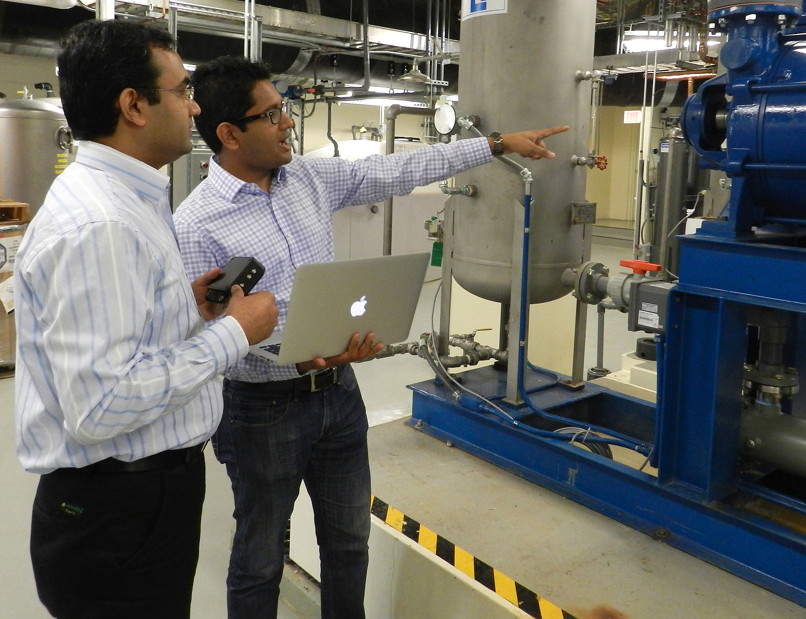 Anurag Garg, DATTUS co-founder and CEO, and Lokesh Gupta, Ph.D., CTO, survey locations to install the company's sensors that monitor industrial rotating systems. DATTUS has licensed a Purdue University innovation, to provide an industrial Internet-of-Things hardware and software platform, to make industrial machinery smarter and help industrial facilities compete in the rapidly evolving industrial environment through data-driven intelligent decision-making. (Purdue Research Foundation photo) |