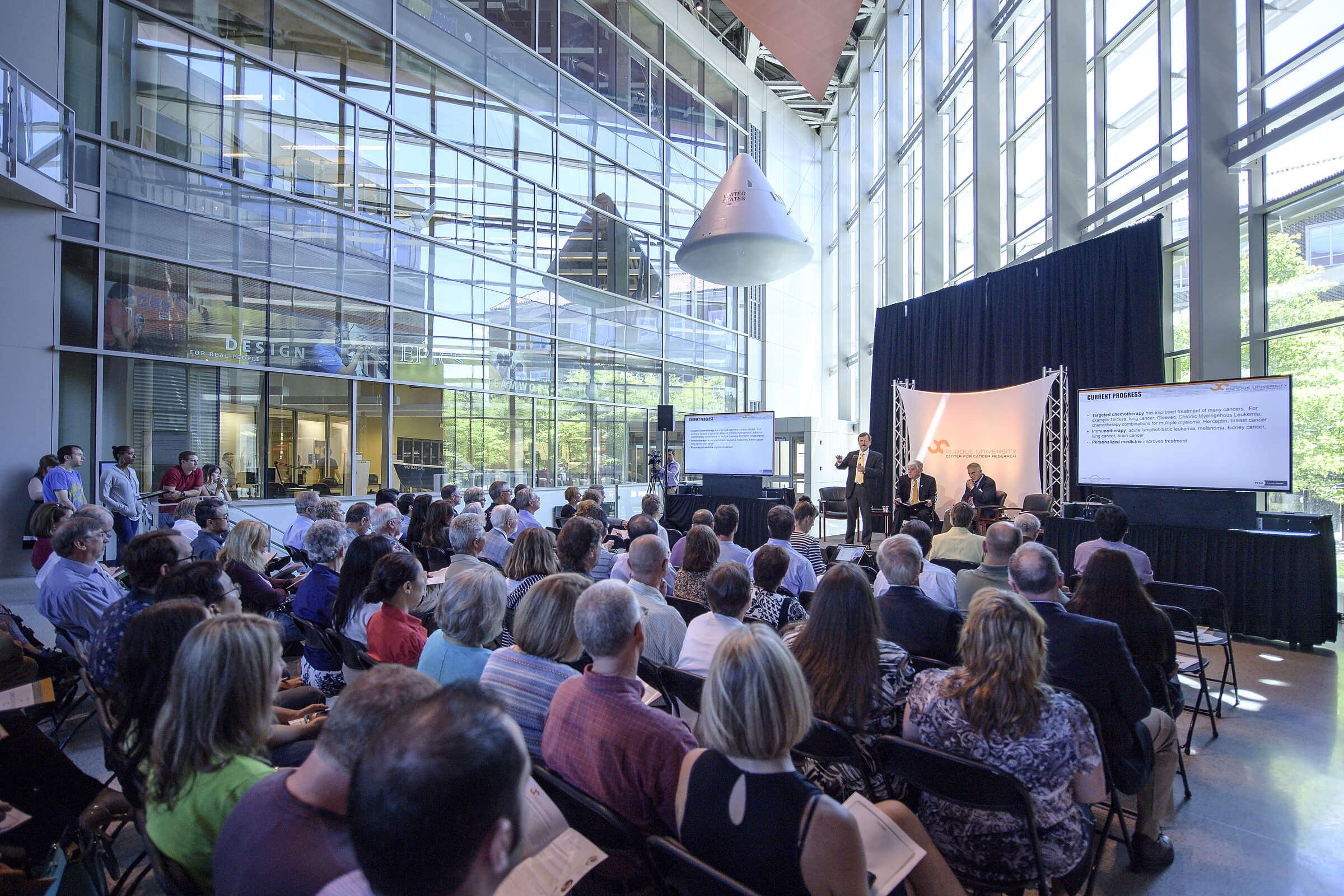 The Purdue University Center for Cancer Research hosts a Cancer Moonshot Summit in the atrium of the Neil Armstrong Hall of Engineering on Purdue's campus. Astronaut and Purdue alumnus, Dr. David Wolf, gave remarks. Timothy Ratliff, distinguished professor of comparative pathobiology and the Robert Wallace Miller Director of the Purdue University Center for Cancer Research, speaks as Dr. Wolf and Mike Piggot, director of community relations who moderated the event, listen on stage. (Purdue University photo/Charles Jischke)