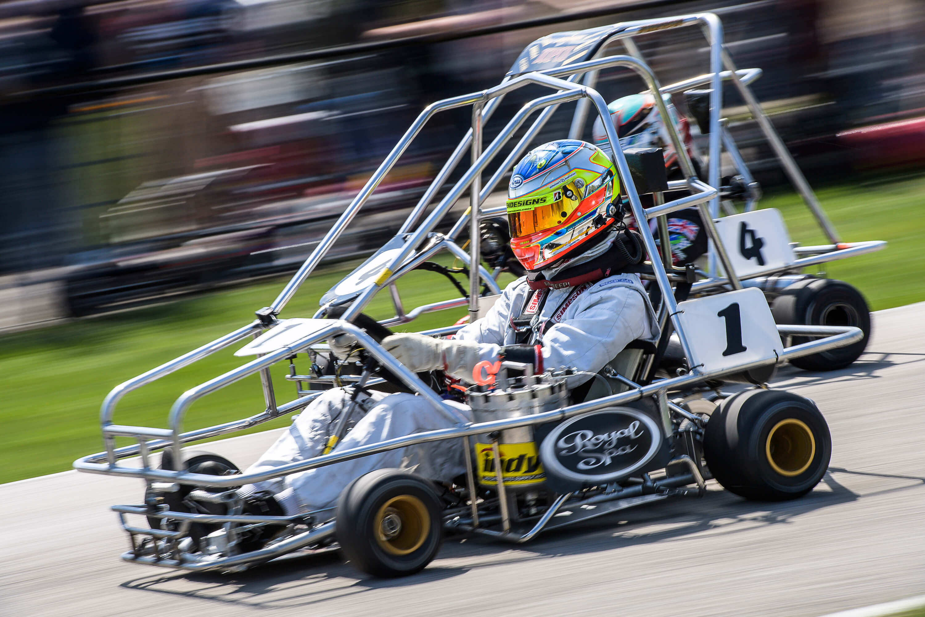 Simpson started second behind pole winner Chip Challis in the No. 22 kart. He survived a chaotic start with wheels bumping and karts colliding to take the lead on lap 32 when Challis left the race with an issue.