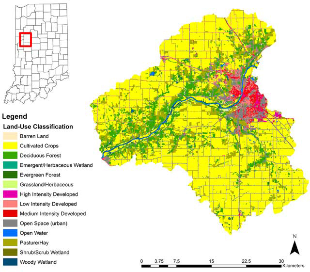 This graphic shows location and land use of the Great Bend of the Wabash River Watershed from the 2001 U.S. Geological Survey Land Cover Dataset. (Muenich et al.)