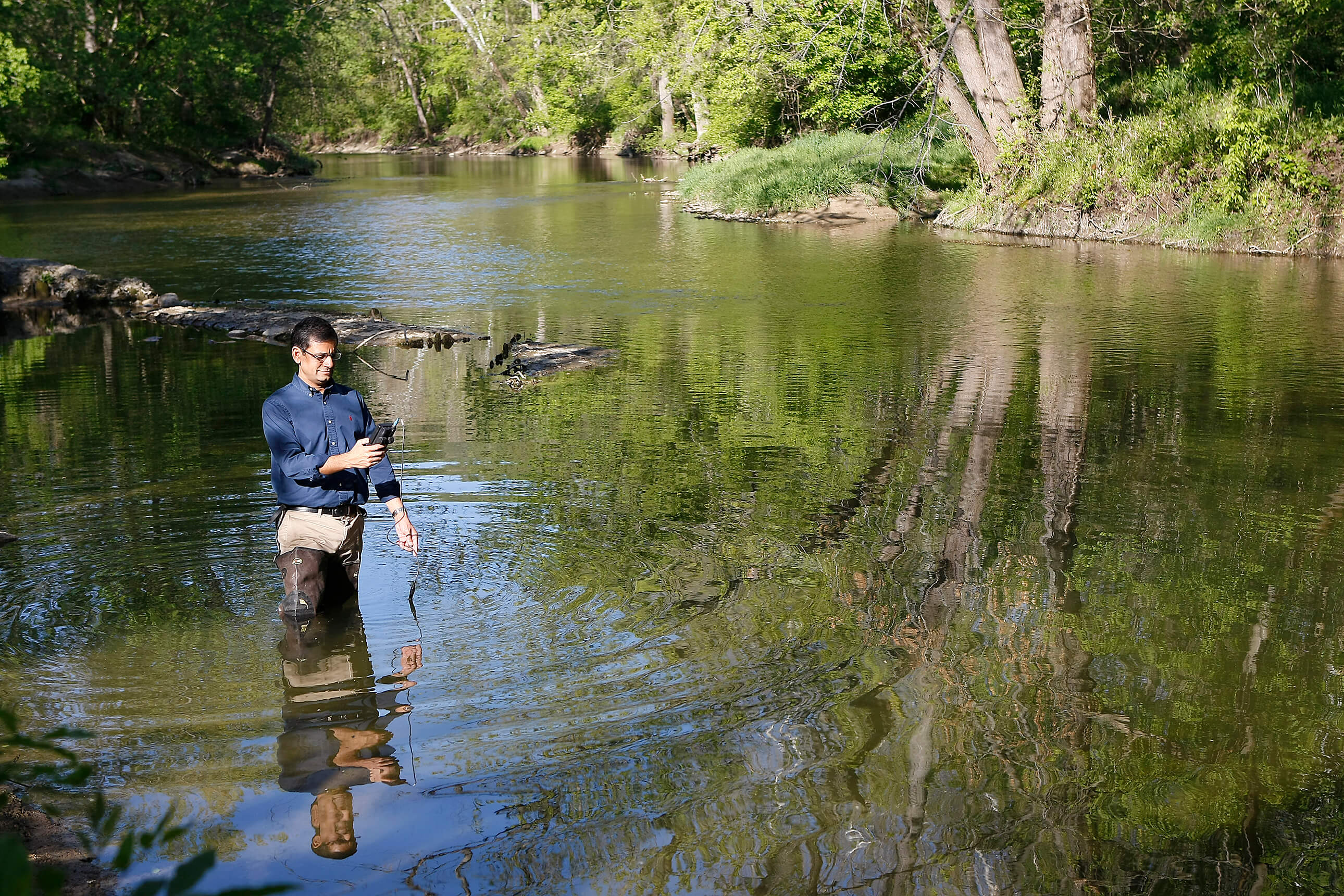 Indrajeet Chaubey, a professor of ecohydrology, tests water quality in Wildcat Creek, a tributary of the Wabash River. (Purdue Agriculture/Tom Campbell)