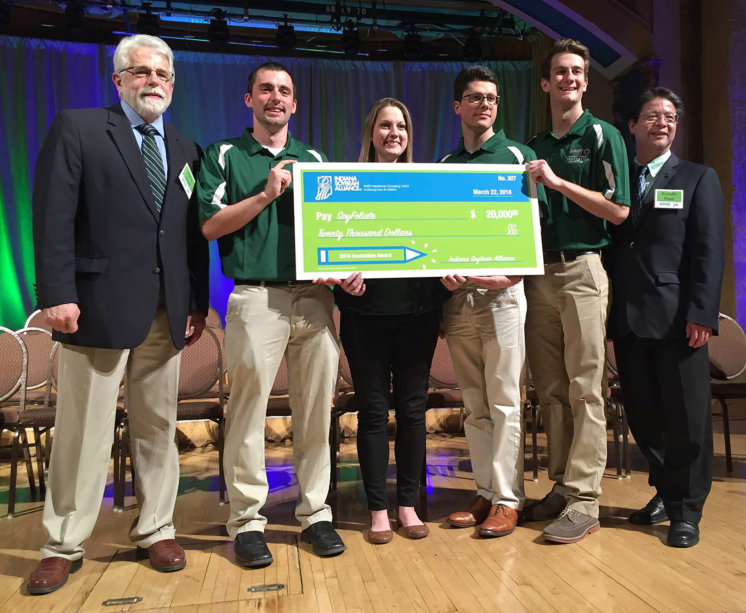 The team entered their product, SoyFoliate, in the Purdue University Student Soybean Innovation Competition, a contest sponsored by the Indiana Soybean Alliance. The ISA awarded SoyFoliate first place and a $20,000 award.