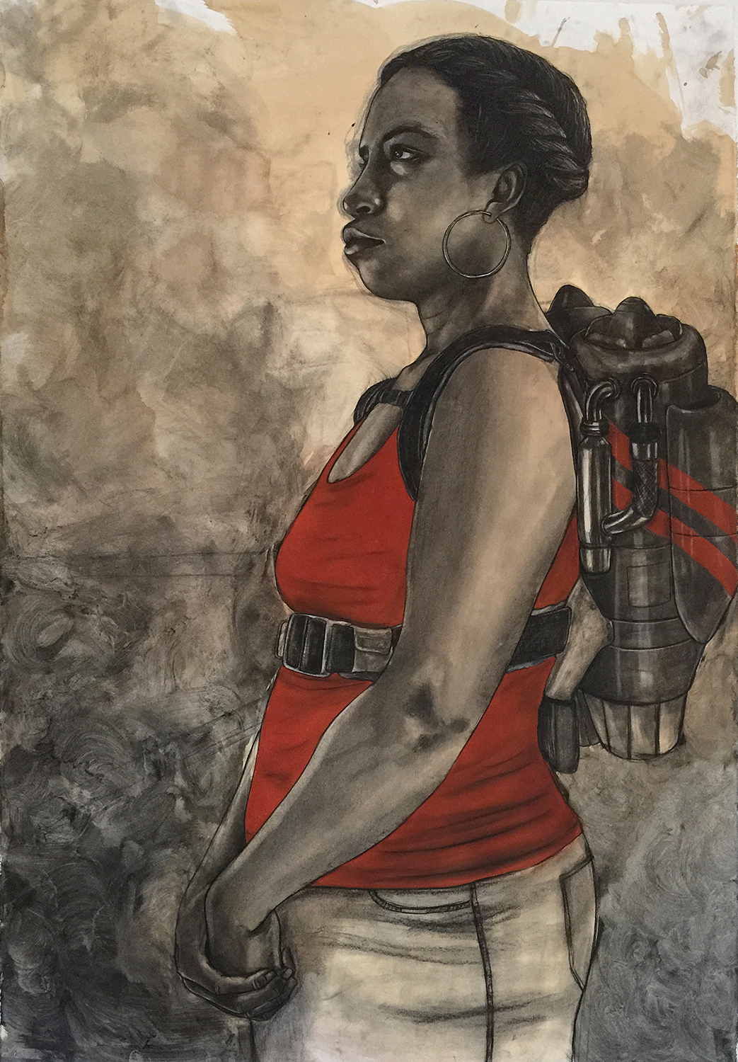 Galleries_PruittAltitude Robert Pruitt (Houston, TX), “Your Altitude Determines Your Attitude” (Jet Pack Piece), coffee, charcoal and mixed media on paper, 44 x 31 inches, 2015. Download image