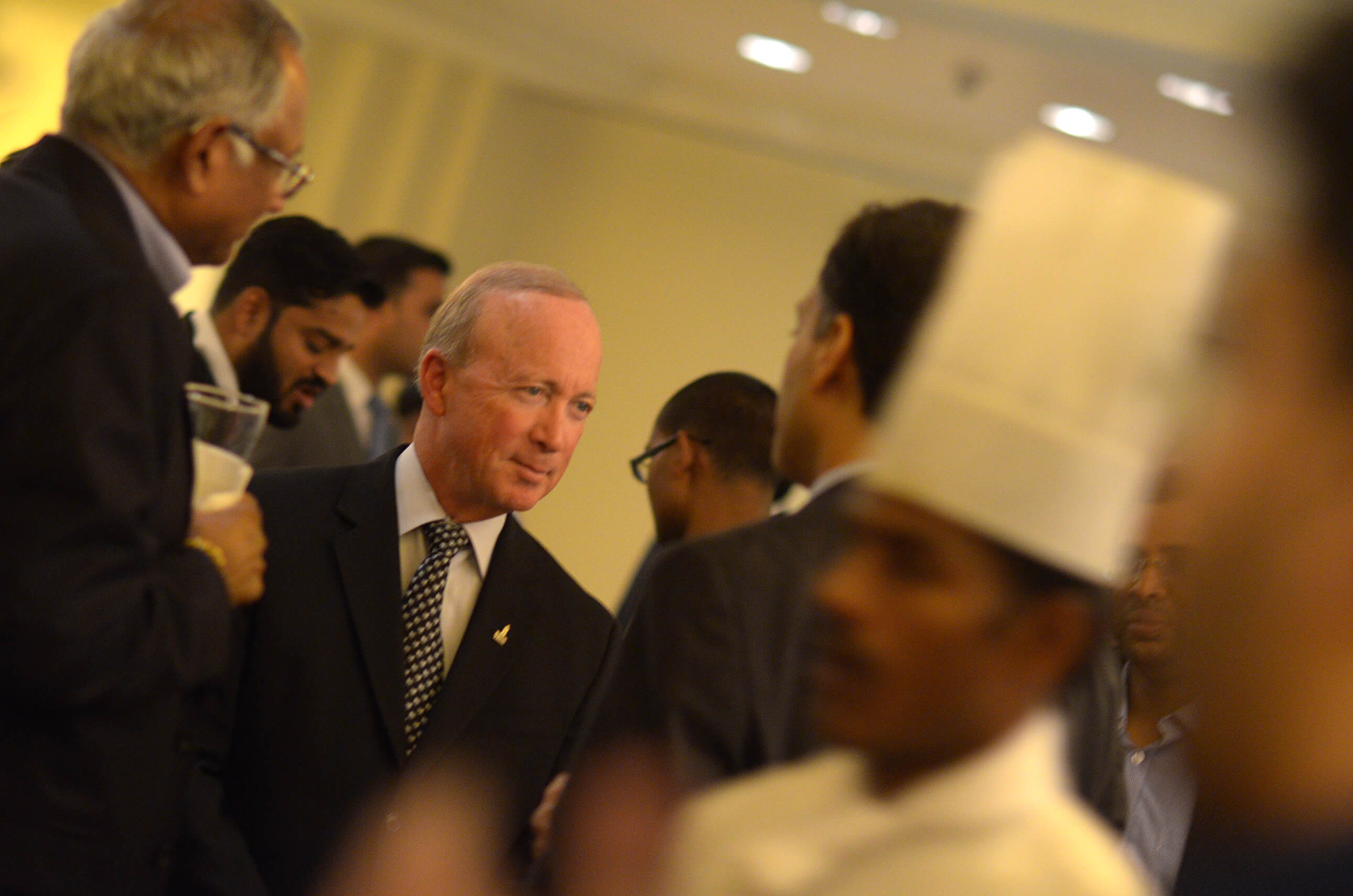 President Mitch Daniels on Tuesday (Oct. 25) connects with Purdue alumni and friends in Bangalore, India, during the launch of Ever True: International Engagement Campaign. (Purdue University photo)