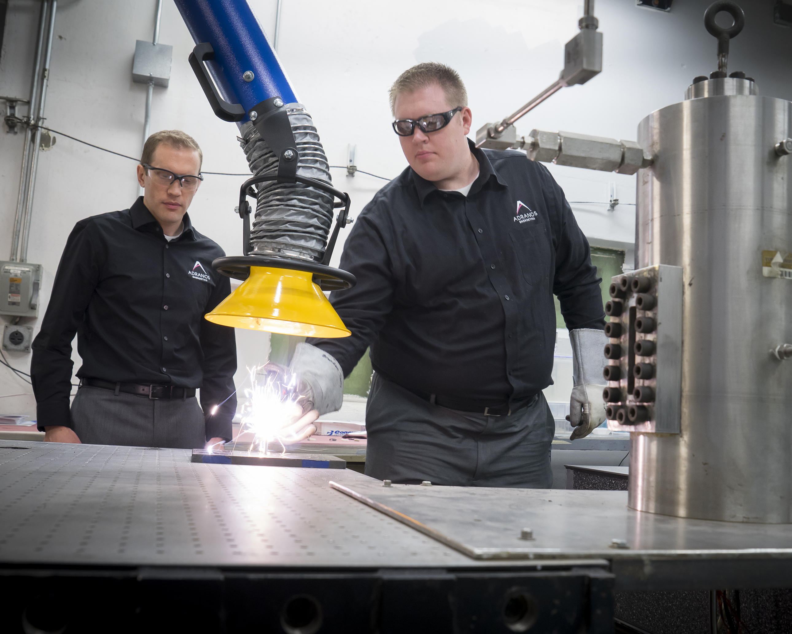 Chris Stoker, an Indiana University alumnus, and Brandon Terry, a Purdue postdoctoral research associate, are pictured burning samples of solid rocket fuel propellant in the Maurice J. Zucrow Laboratories at Purdue. Stoker and Terry co-founded Adranos Energetics, a company developing a cleaner, more efficient rocket fuel propellant that uses micro-explosive tendencies to produce much higher combustion efficiency and decreased flow losses. (Purdue Research Foundation photo)