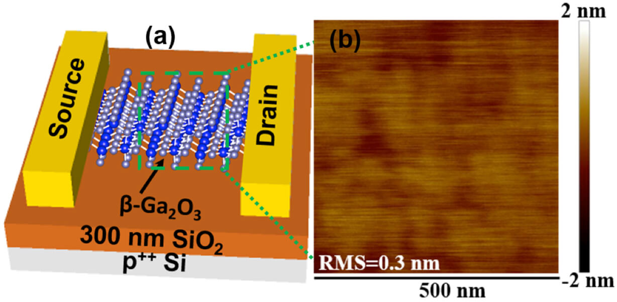 The schematic at left shows the design for an experimental transistor made of a semiconductor called beta gallium oxide, which could bring new ultra-efficient switches for applications such as the power grid, military ships and aircraft. At right is an atomic force microscope image of the semiconductor. (Purdue University image/Peide Ye)