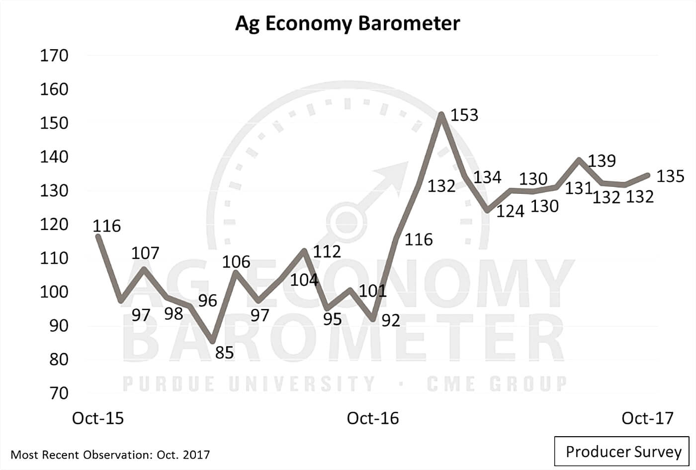 The Purdue/CME Group Ag Economy Barometer climbed to 135 in October, the third-highest producer sentiment reading since data collection began in 2015. (Purdue/CME Group Ag Economy Barometer/David Widmar) |