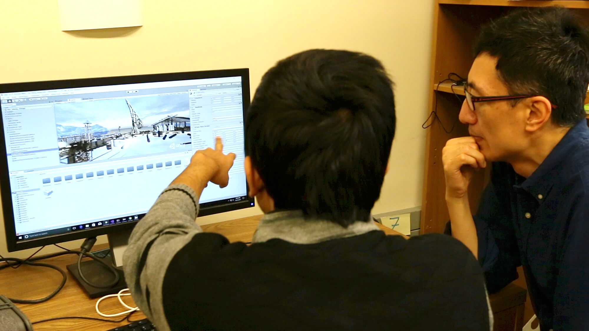 Graduate student Sibendu Paul at left, and Purdue University professor Charlie Hu work with a new software platform that allows for untethered playing of high-quality VR games using a smartphone. (Purdue University image/Erin Easterling)