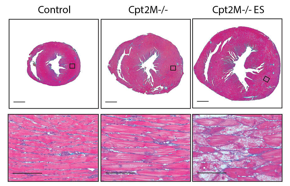 Ellis cardiac Researchers at Purdue University are working to learn more about enlargement of the heart caused by high blood pressure, diabetes, and obesity. These cross-section images of a mouse heart show the rapid enlargement of a mouse heart (control heart on left, enlarged diseased heart in center, and end-stage diseased heart on right) when it is deficient in an enzyme, carnitine palmitoyltransferase 2 (Cpt2), that is needed for cardiac cells to burn fatty acids as fuel. The research found that using fatty acids as fuel is the key biochemical process for the proper function of the heart. (Purdue University image.) Download image