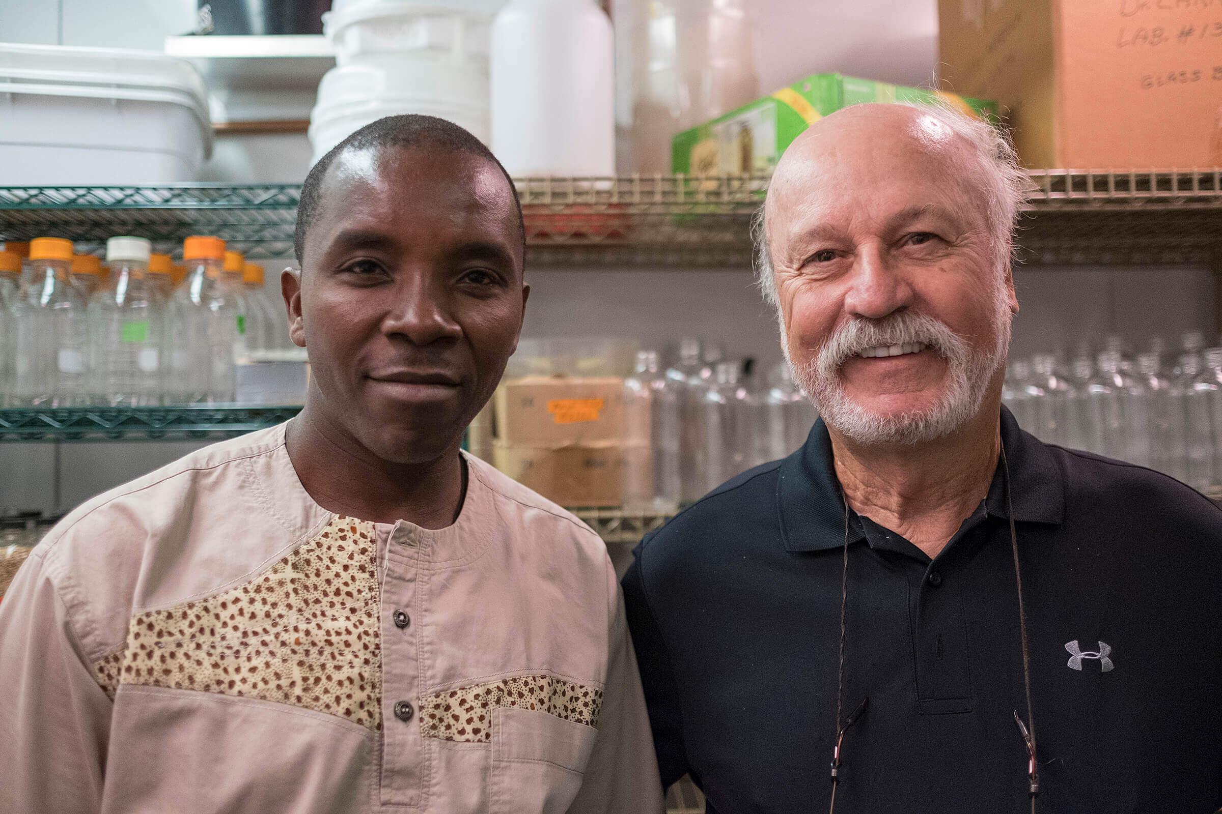Dieudonné Baributsa (left), an associate professor of entomology at Purdue University, and Larry Murdock, a distinguished professor in Purdue’s Department of Entomology in the College of Agriculture, founded PICS Global along with Laurie Kitch, a former Ph.D. student of Murdock’s. PICS Global initially made its specially designed bags to prevent insect-caused post-harvest losses available to farmers in developing countries, but is now making them commercially available worldwide. (Purdue Research Foundation photo/Oren Darling)