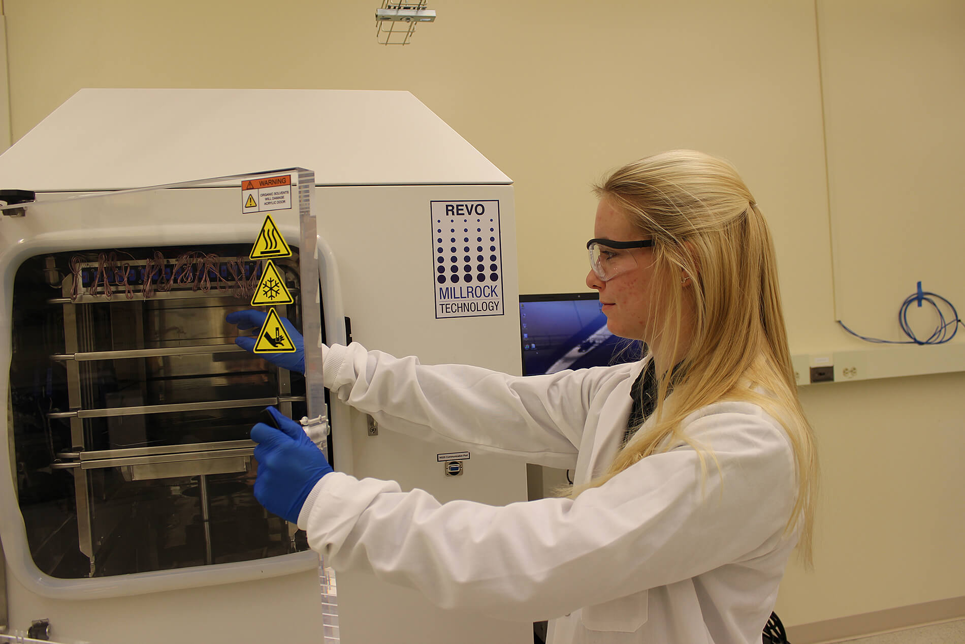 A graduate student loads a freeze dryer at Purdue University’s LyoHub facility in Birck Nanotechnology Center. LyoHub has a comprehensive laboratory for freeze-drying development, optimization and training. (Image provided by Jennifer Gray)
