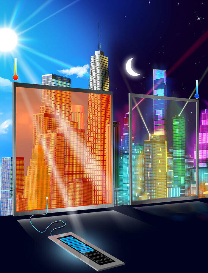 An illustration displays the day to night changes and potential power output in solar cell film transitions. (Illustration/Jia Lin)