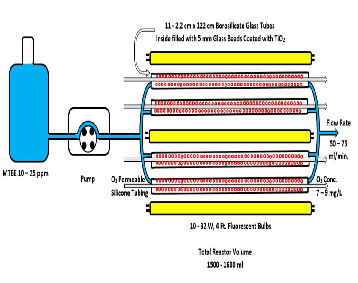 The photoreactors are made of glass tubes, with silicone tubing inside for oxygenation, packed with glass beads and lined with the same fluorescent light tubes found in most homes. The tubing is pressurized and then water flows through and the combination of the light, silicone and glass removes the trace contaminants.