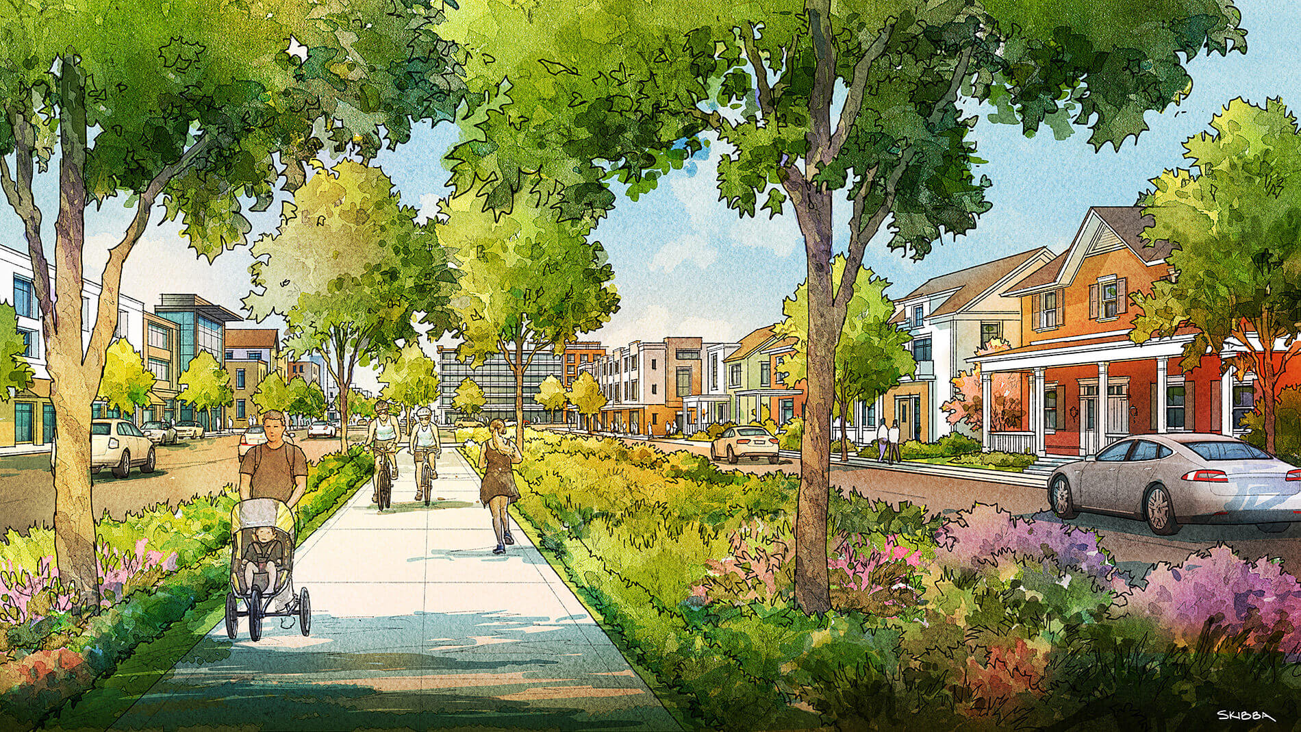 Discovery Park District’s residential village is envisioned as a walkable new neighborhood of predominantly single-family homes including attached townhomes, cottages and detached houses. (Image provided by Browning)