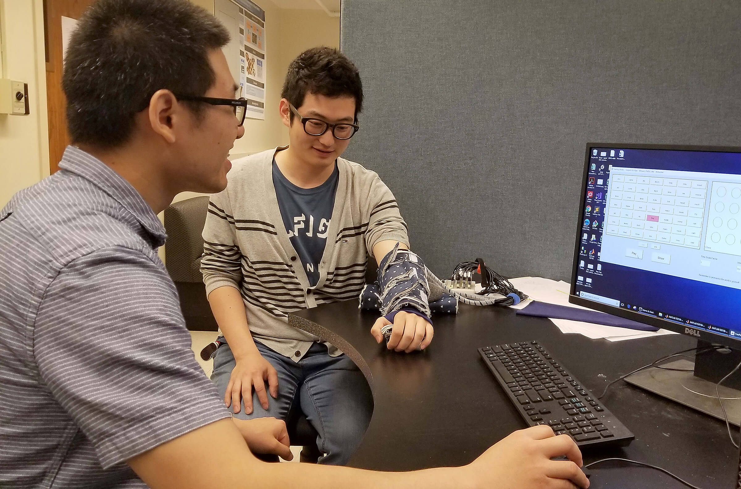 Postdoctoral student Yang Jiao communicates words to Jaeong Jung, an undergraduate student, using phoneme signals transmitted to the haptic device on his forearm. (Purdue University photo/Brian Huchel)