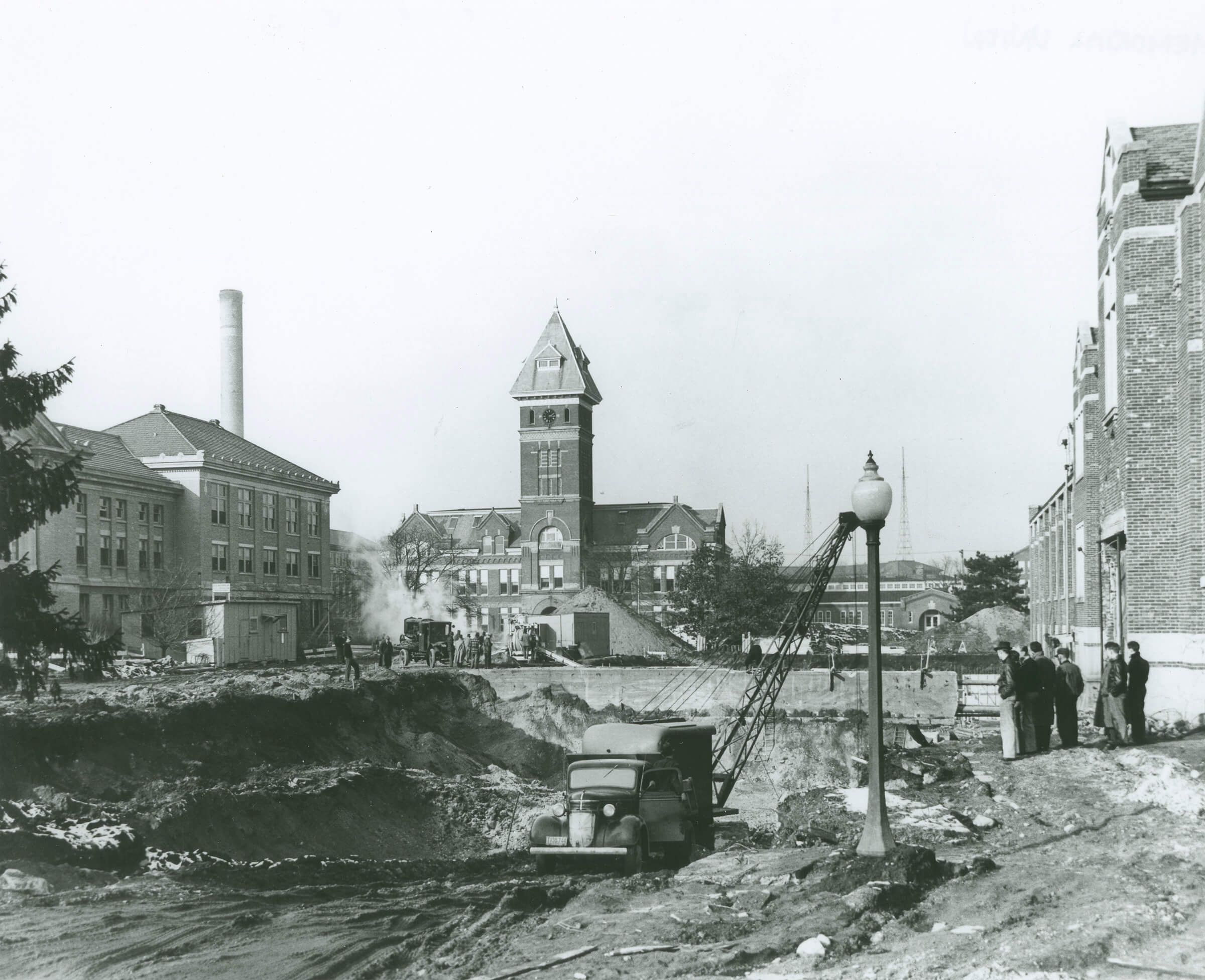 In this photo from about 1935, construction is underway on the west addition to Purdue Memorial Union. The view looks mainly north with the Union on the right, Heavilon Hall (rear) the North Power Plant smokestack and University Library (left). In the 1950s, University Library was absorbed by the construction of Memorial Center (now known as Stewart Center) and it still stands today. (Purdue University photo/Purdue Archives and Special Collections)