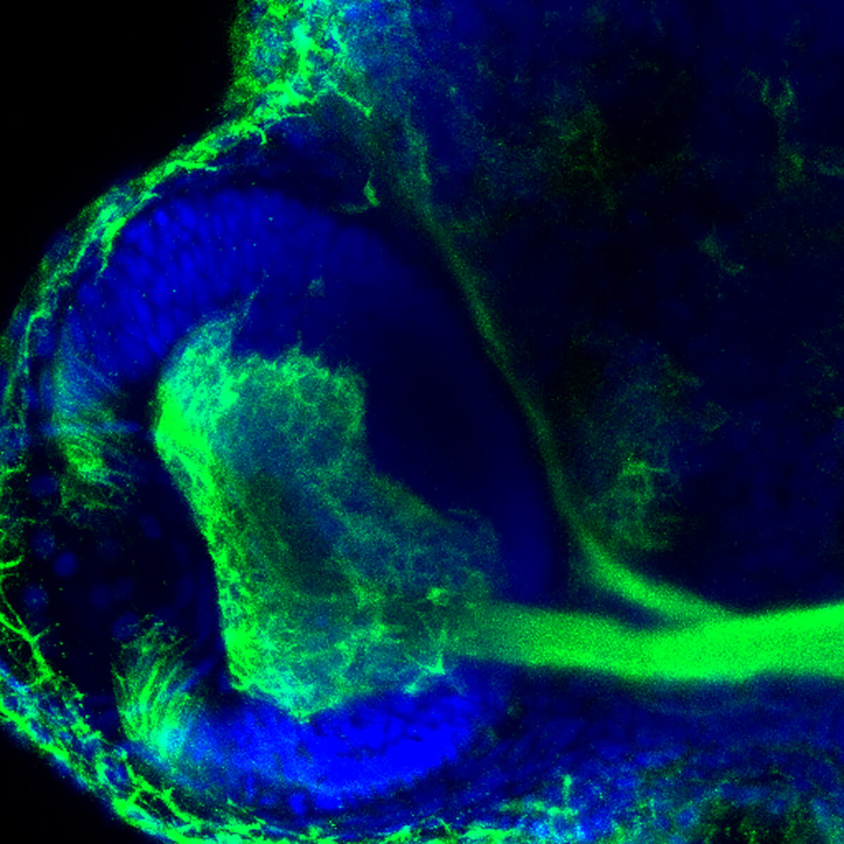 The eye of a zebrafish embryo deficient in NADPH oxidase 2 has an enlarged ganglion cell layer (green) and altered innervation of the brain, which leads to problems with signaling between the eyes and the brain.