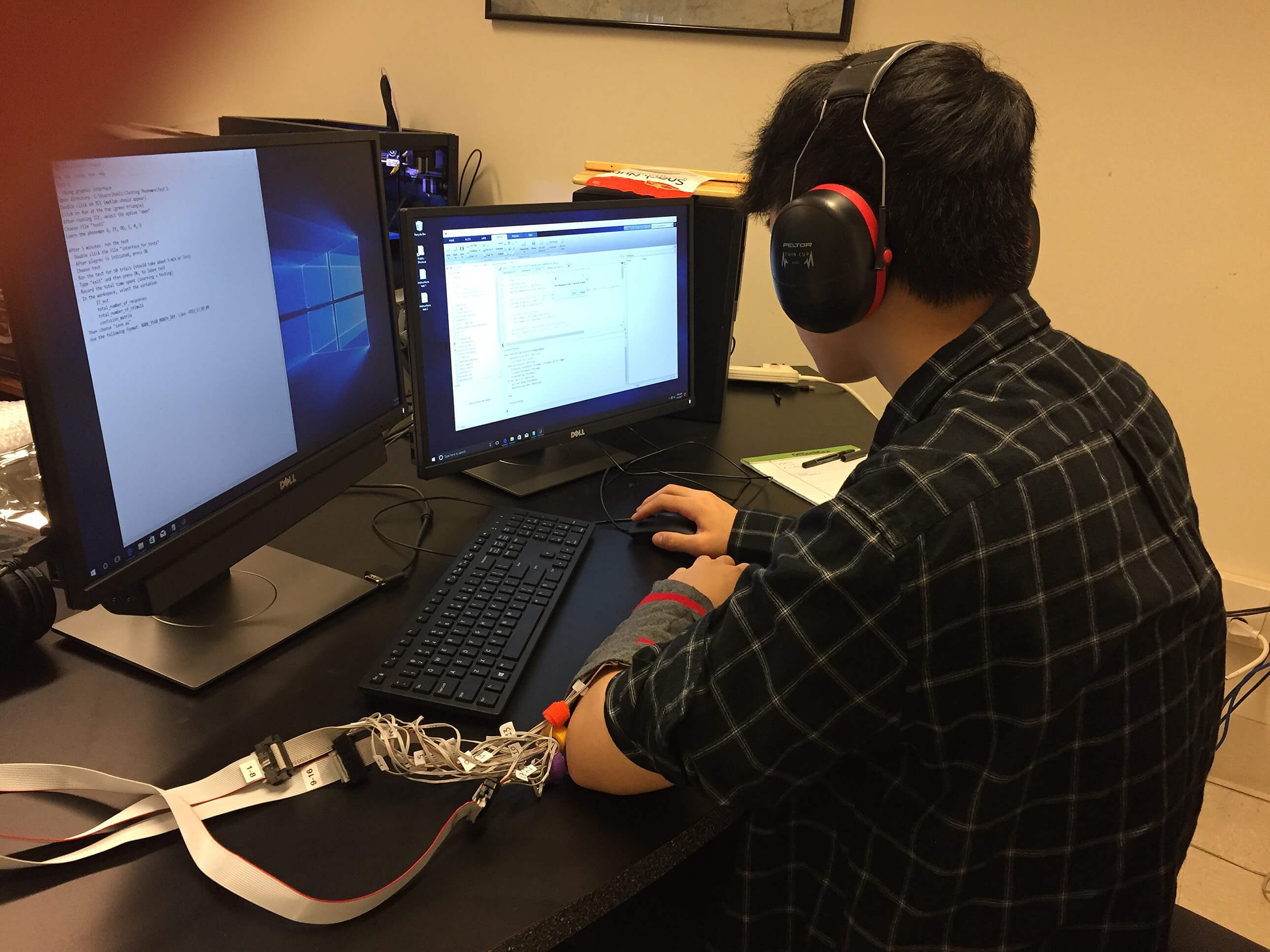 Kevin Tan, a participant in the study, learns English sounds through haptic communication technology developed by Purdue researchers. The device plays specific sensations on the user’s forearm, as he notes the corresponding English phoneme, or the smallest unit of sound. (Image provided)