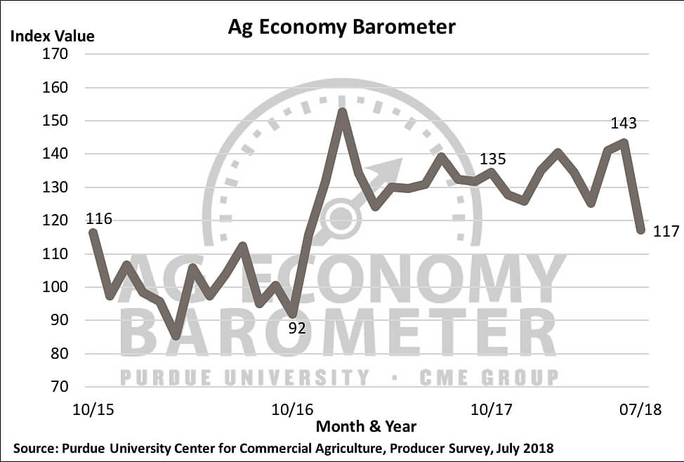 WEST LAFAYETTE, Ind. and CHICAGO – The Purdue University/CME Group Ag Economy Barometer declined 26 points, down to 117, in July making it the largest one-month decline in producer sentiment since data collection began in October 2015. The drop in sentiment was fueled by increasing trade war concerns and decreasing commodity prices.