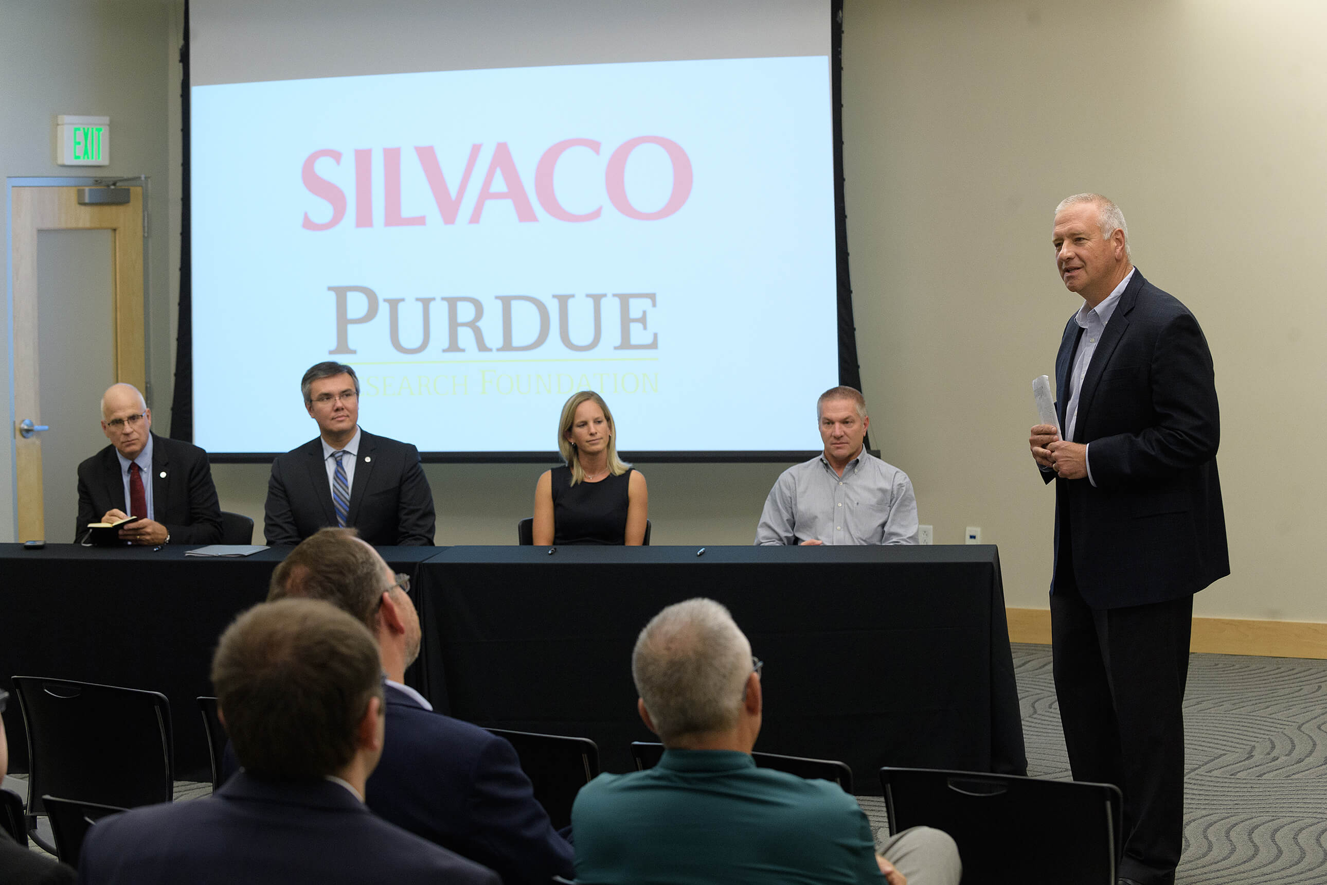 Purdue Research Foundation President Brian Edelman speaks at contract signing event with Silvaco Inc. officials Thursday (Aug. 23) at the Kurz Purdue Technology Center. Silvaco will license Purdue University intellectual property, sponsor research at Purdue and open an office in the Purdue Technology Center. Seated at the table, from left, are David Dutton, Silvaco CEO; Iliya Pesic, executive chairman of the Silvaco board of directors; Brooke Beier, vice president of the PRF Office of Technology and Commercialization; and Ken Sandel, senior director of Purdue sponsored program services. (Purdue Research Foundation Image/John Underwood)