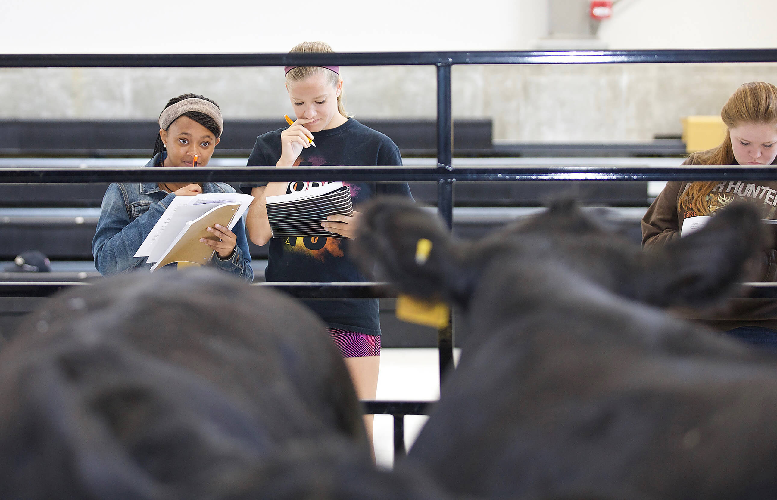 Purdue Agriculture this fall welcomed its largest undergraduate enrollment in 38 years and a large segment of them are women. Here, students in an animal science class evaluate beef cattle in the Land O’Lakes Pavilion on campus. (Purdue University photo/Tom Campbell)