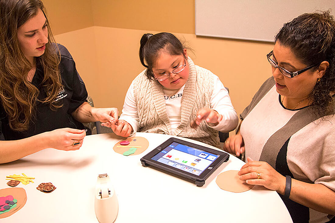 Victoria Casas (center) and her mother Elba Casas (right) complete a language learning activity on SPEAKall! with the help of former Purdue student Madison Logan. (Purdue Research Foundation image/Oren Darling)