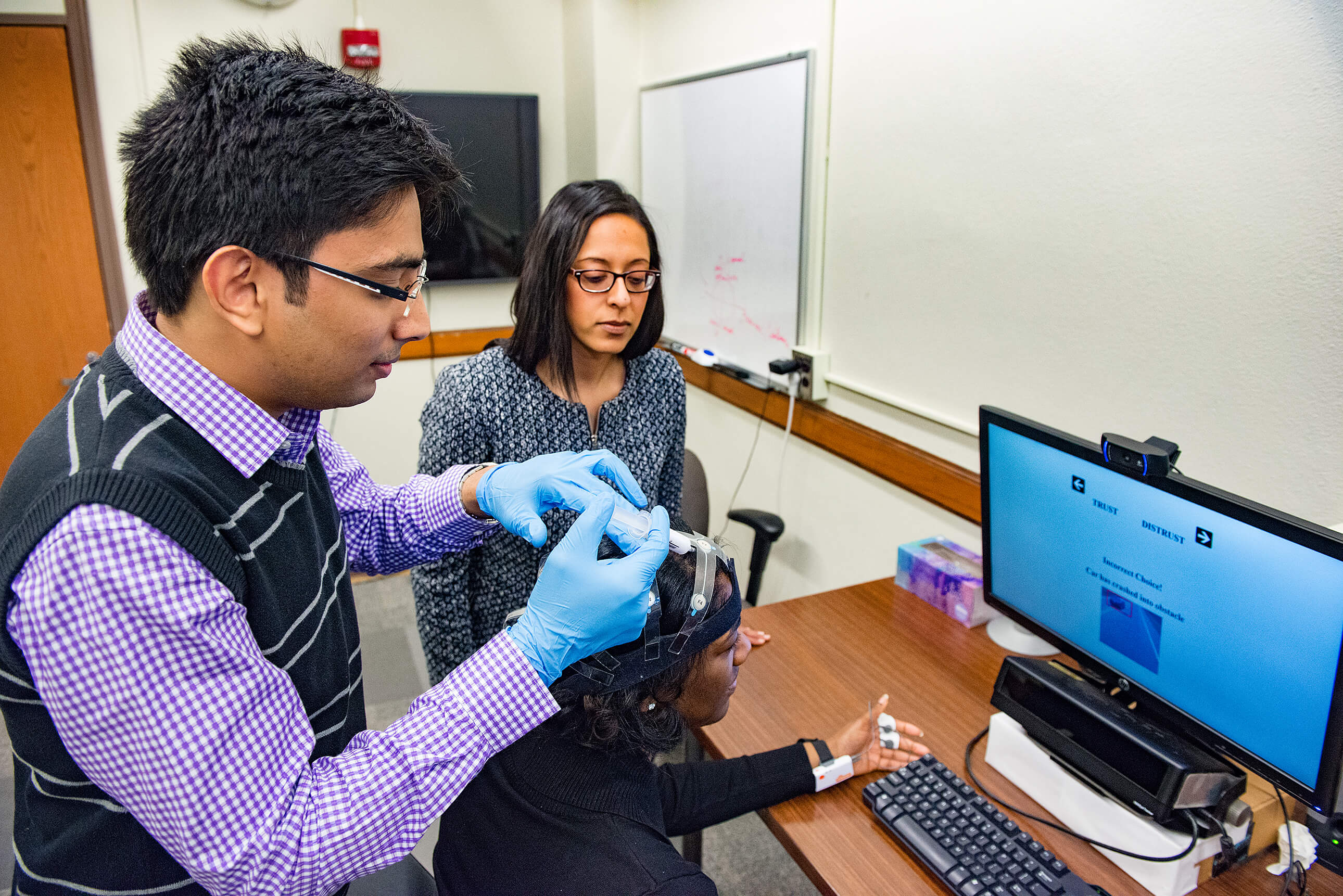 Purdue University researchers are the first to use EEG measurements to estimate human trust of intelligent machines in real time. (Purdue University photo/Marshall Farthing)
