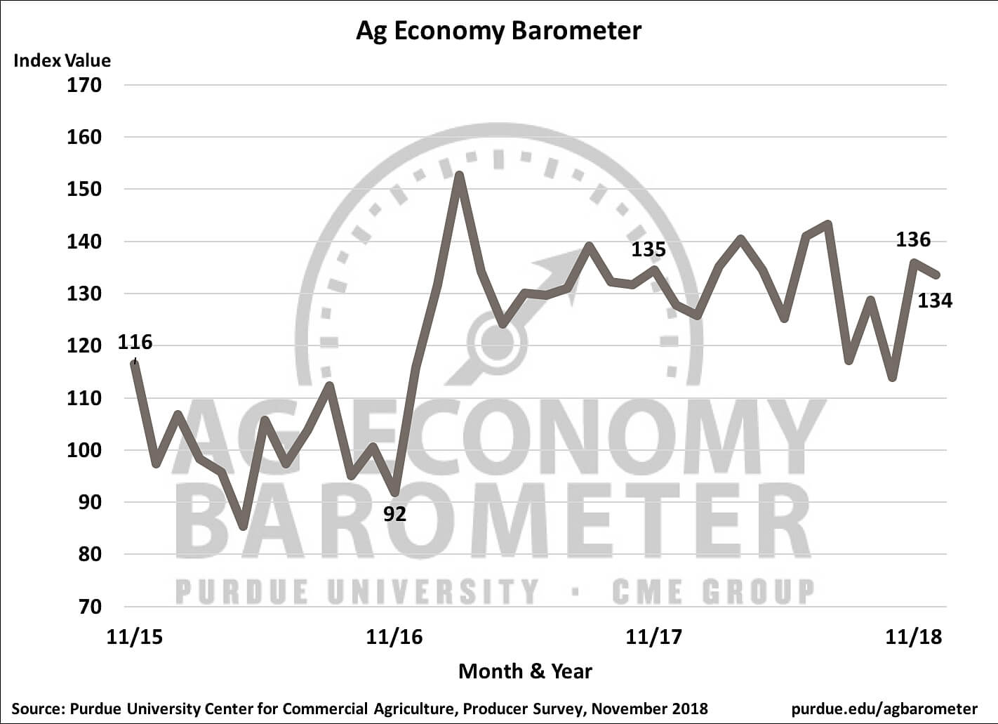 WEST LAFAYETTE, Ind. and CHICAGO – Agricultural producer sentiment held steady in November with producers remaining optimistic about the state of the agricultural economy, according to results from the Purdue University/CME Group Ag Economy Barometer. The November barometer reading of 134 was only 1 percent lower than October, which is similar to levels seen last spring before trade disruptions began. The barometer utilizes a survey of 400 agricultural producers from across the country.