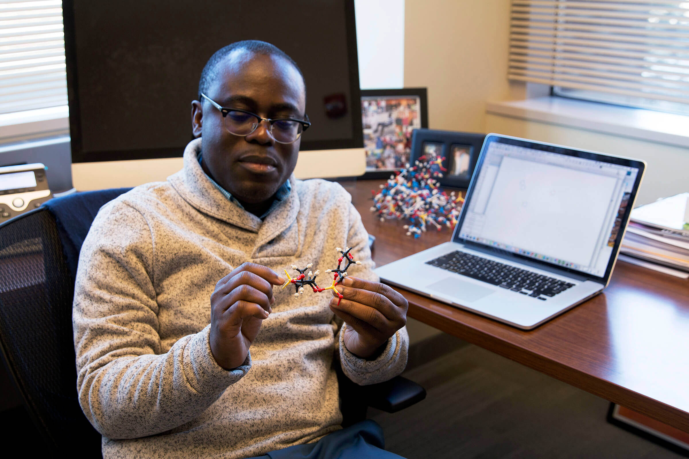 Herman Sintim, the Drug Discovery Professor of Chemistry in Purdue University’s Department of Chemistry, is leading a team of researchers developing a series of drug compounds that have shown promise in treating acute myeloid leukemia, most notably in cases where patients have a recurrence of the fairly rare but aggressive blood cancer that is one of the most lethal cancers. Here, Sintim looks at a model of a molecule. (Purdue Research Foundation image/Hope Sale)