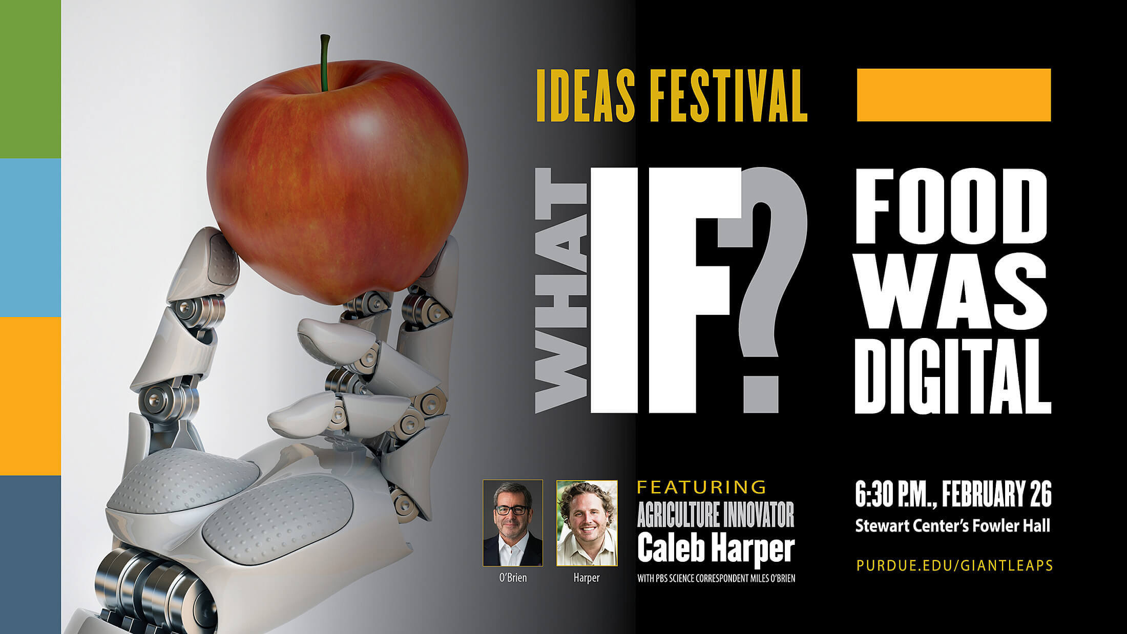 “What IF food was digital?” is the question that will be at the center of a discussion with Miles O’Brien and Caleb Harper during a Feb. 26 event in the Stewart Center. (Purdue University graphic)