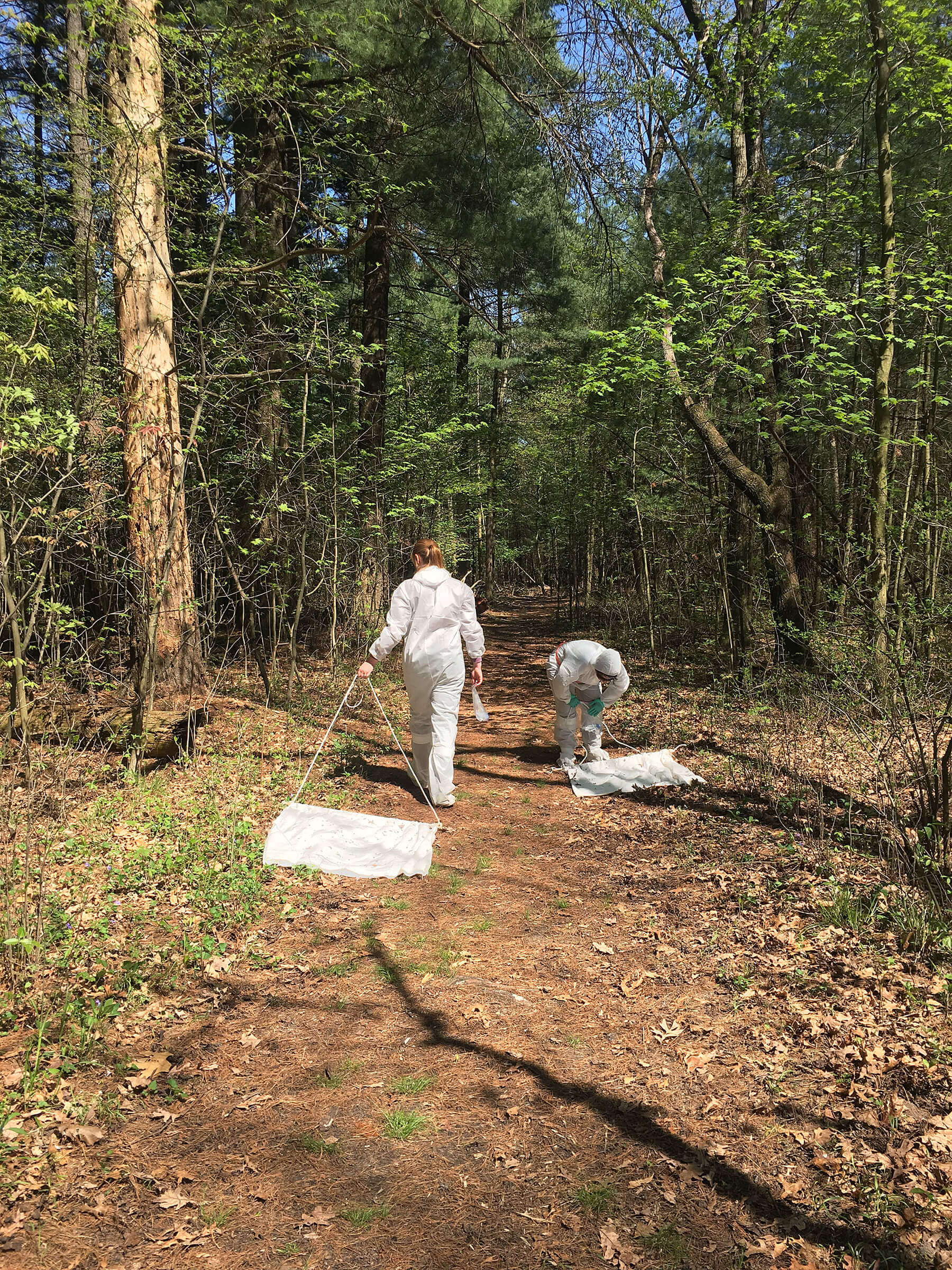 Scientists from Purdue's Tick INsiders program, Lauren Hagen (left) and Maria Muriga (right), drag and check tick cloths at Tippecanoe River State Park in 2018. The program is looking for high school students and citizen scientists interested in helping with tick collections this year. (Tick INsiders photo)
