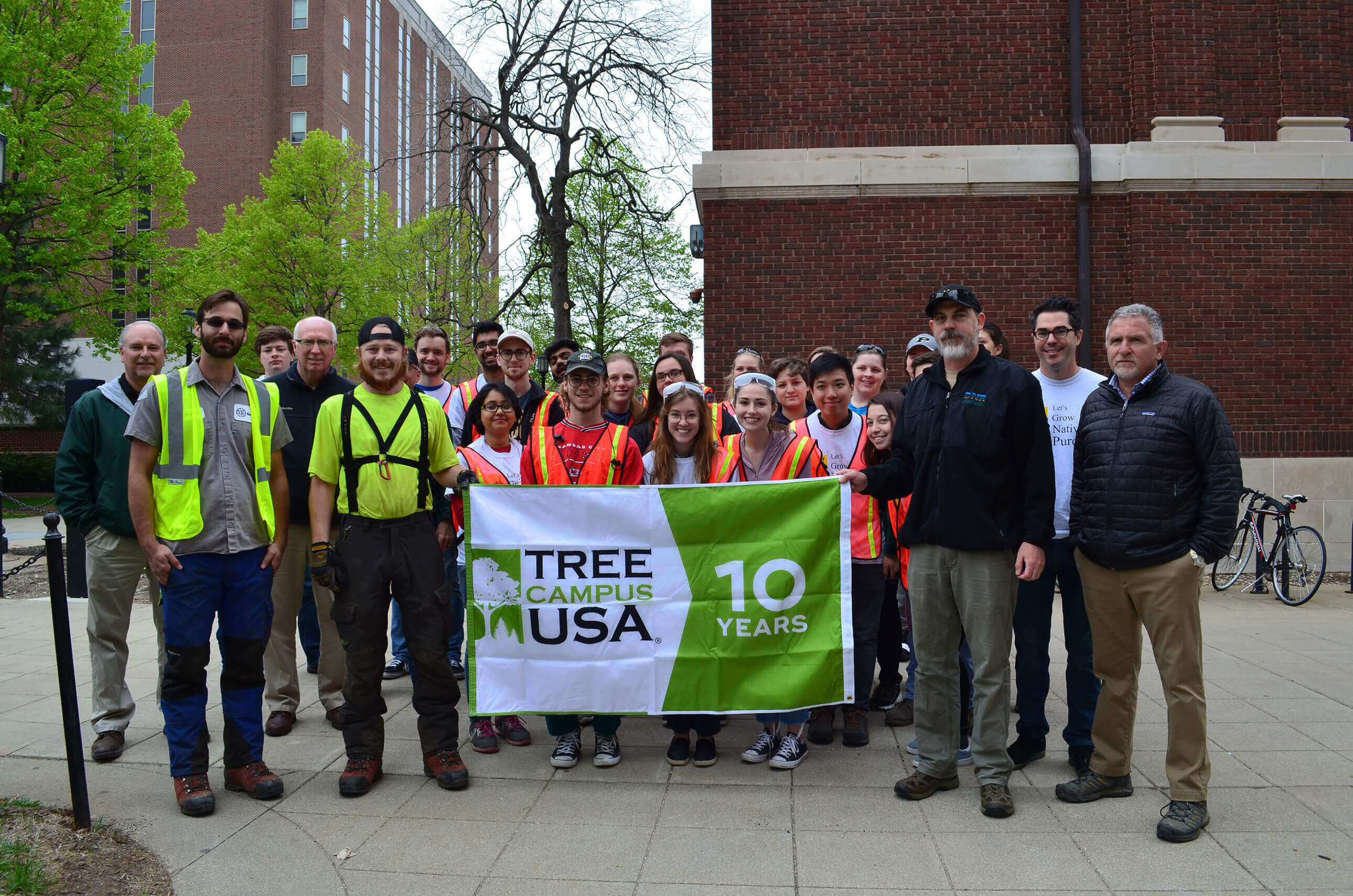 Purdue University has been recognized as a Tree Campus for the 10th consecutive year and received a celebratory banner at its Earth Week tree planting event on April 25. Photo provided by Administrative Operations Communications.