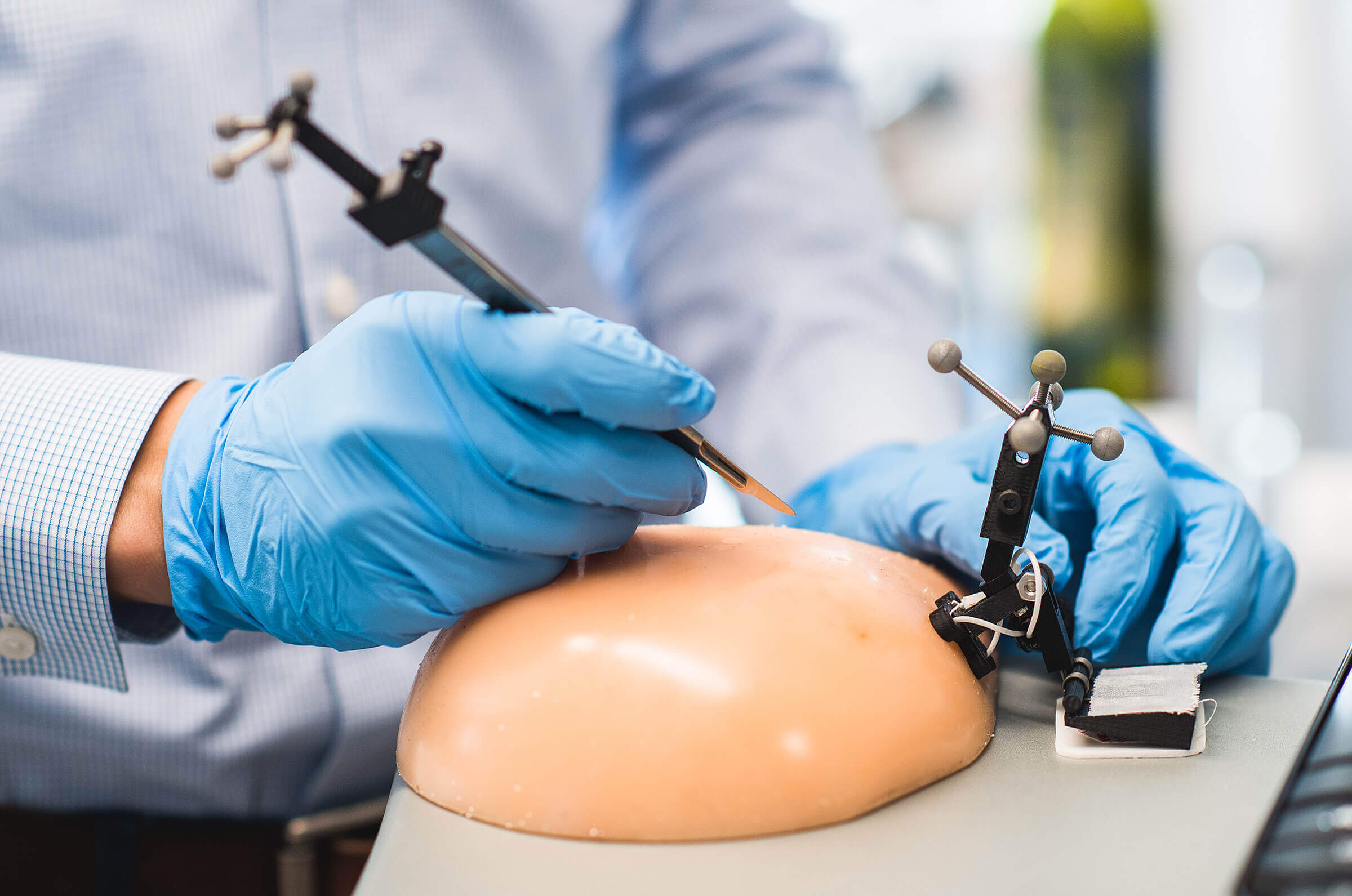 vibronixacoustar Testing the AcouStar with a scalpel and sensor patch on a silicone “phantom.” Vibronix Inc., a Purdue University-affiliated company, is developing the surgical tool to help surgeons remove breast cancer tumors faster and more accurately. (Photo by Jackie Ricciardi for Boston University Photography) Download image