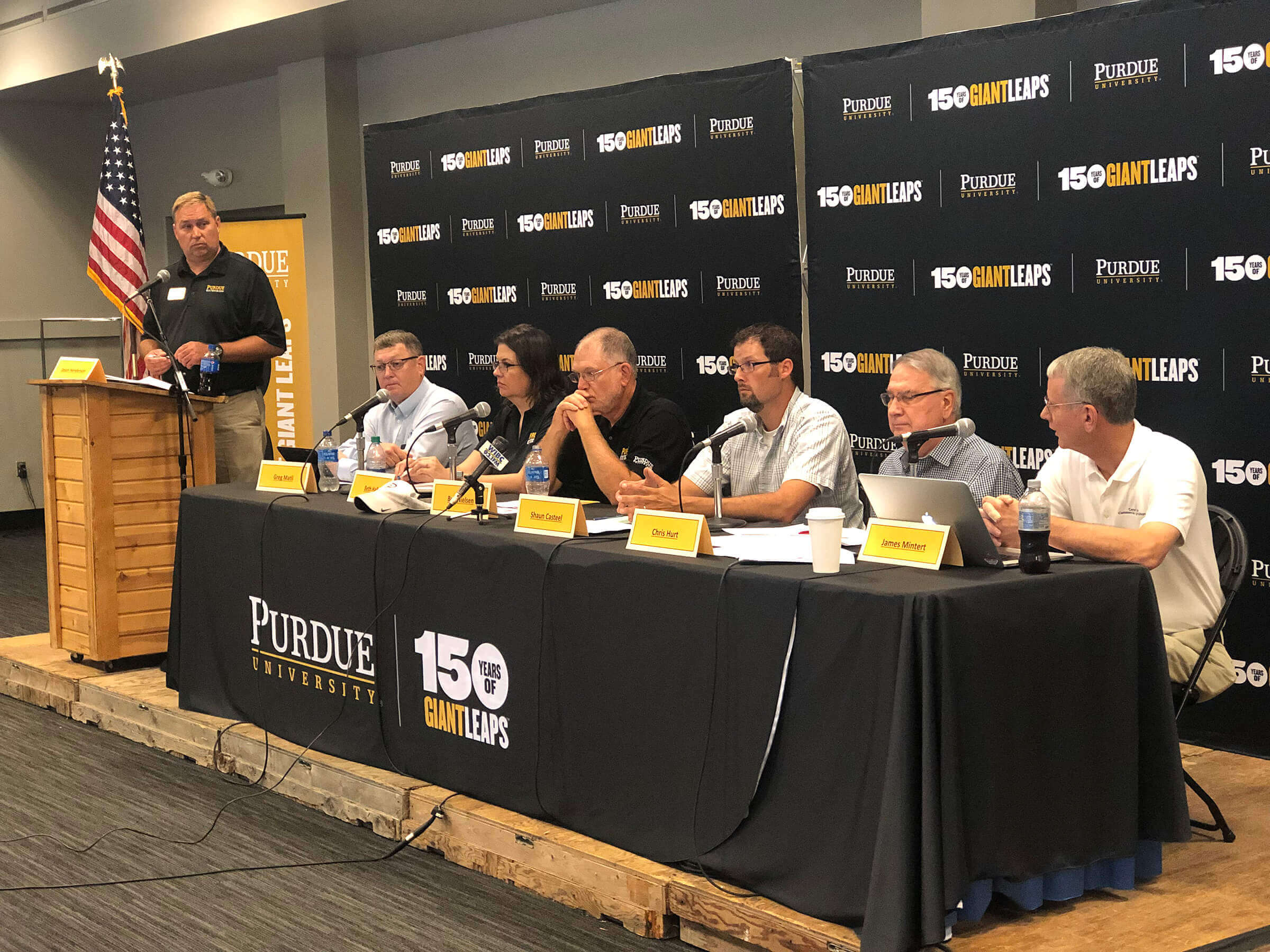 Purdue Extension and USDA experts gathered at the Indiana State Fairgrounds on Monday (Aug. 12) to discuss the results of the USDA’s crop report and the current status of Indiana’s major cash crops. Jason Henderson, director of Purdue Extension and senior associate dean of the Purdue College of Agriculture, convened the panel. Participants included Bob Nielsen, Purdue professor of agronomy and extension expert in Indiana’s corn management systems; Shaun Casteel, Purdue associate professor of agronomy and Extension soybean and small grains specialist; Beth Hall, the Indiana state climatologist; Chris Hurt and Jim Mintert, professors of agricultural economics and Extension economist; and Matli.