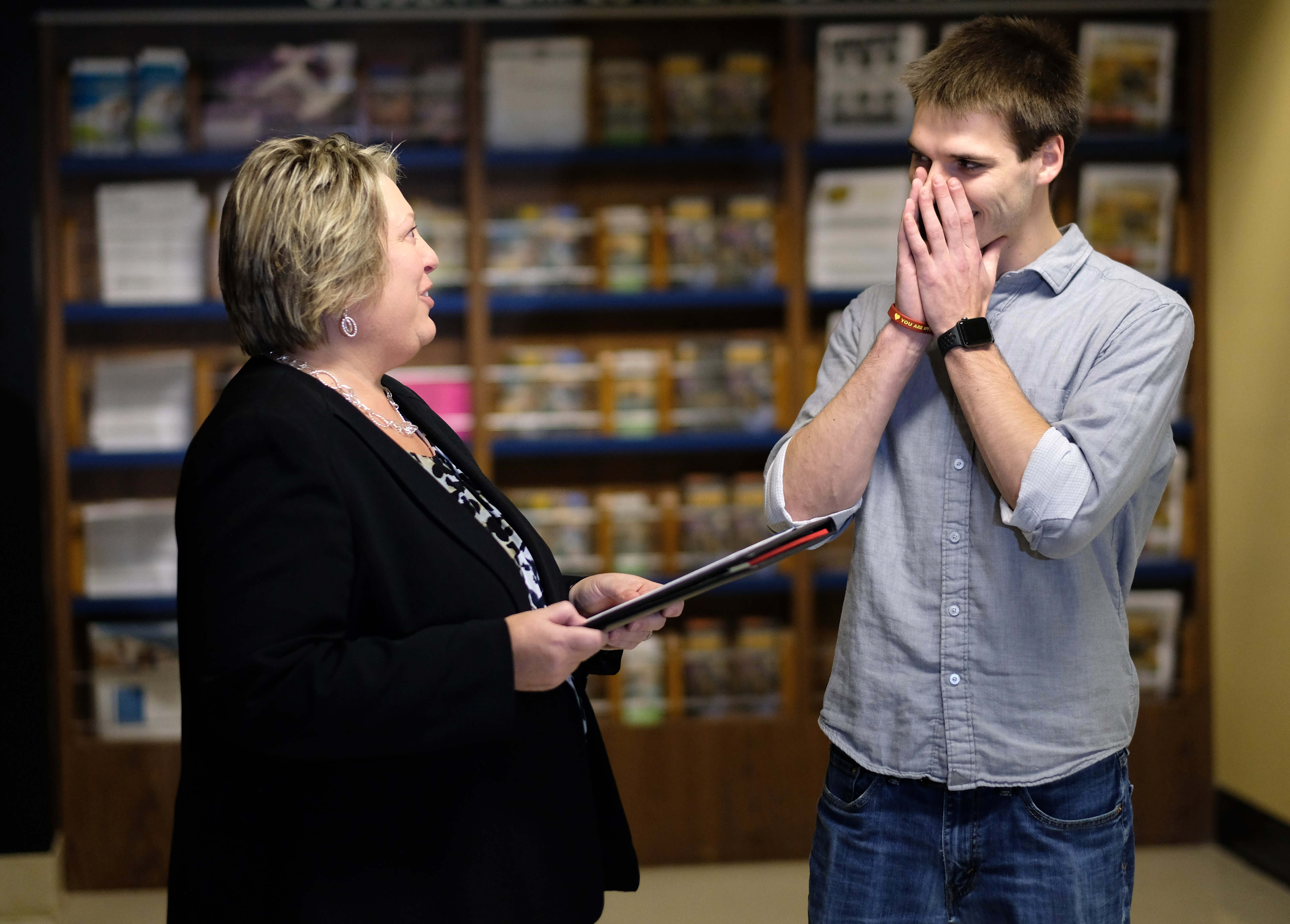 Kai Mangiaracina, at right, reacts to being told by Heidi A. Carl that his current Back a Boiler contract obligation would be cut in half to commemorate the program’s 1,000th contract. (Purdue Research Foundation photo/Oren Darling)