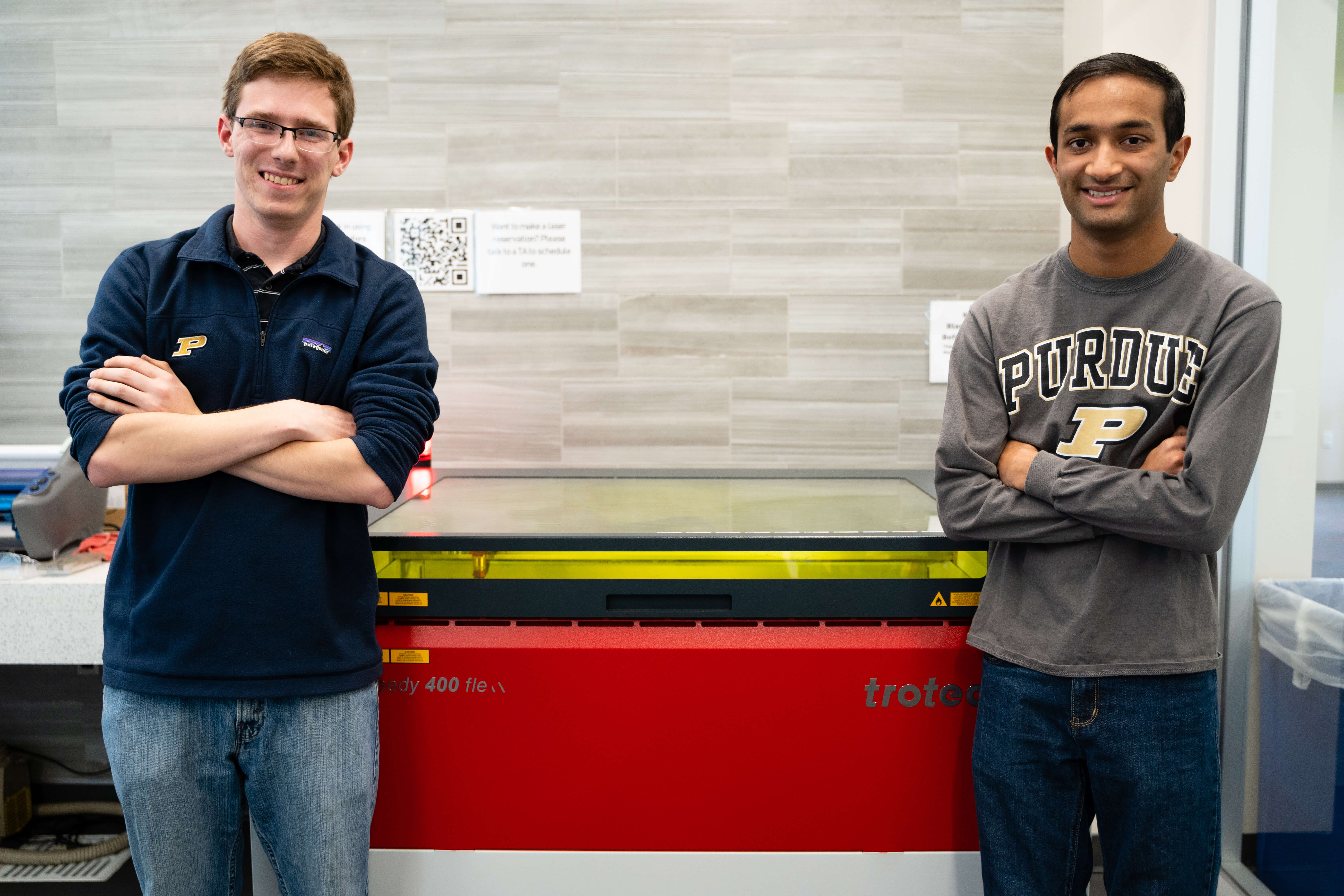 Purdue University students Matthew Fitzgerald and Shiv Patel stand before a laser engraver at the Bechtel Innovation Design Center. The students engraved 36 bookends to commemorate the historic Lafayette Street Railway. (Nick Wang/Purdue Foundry)