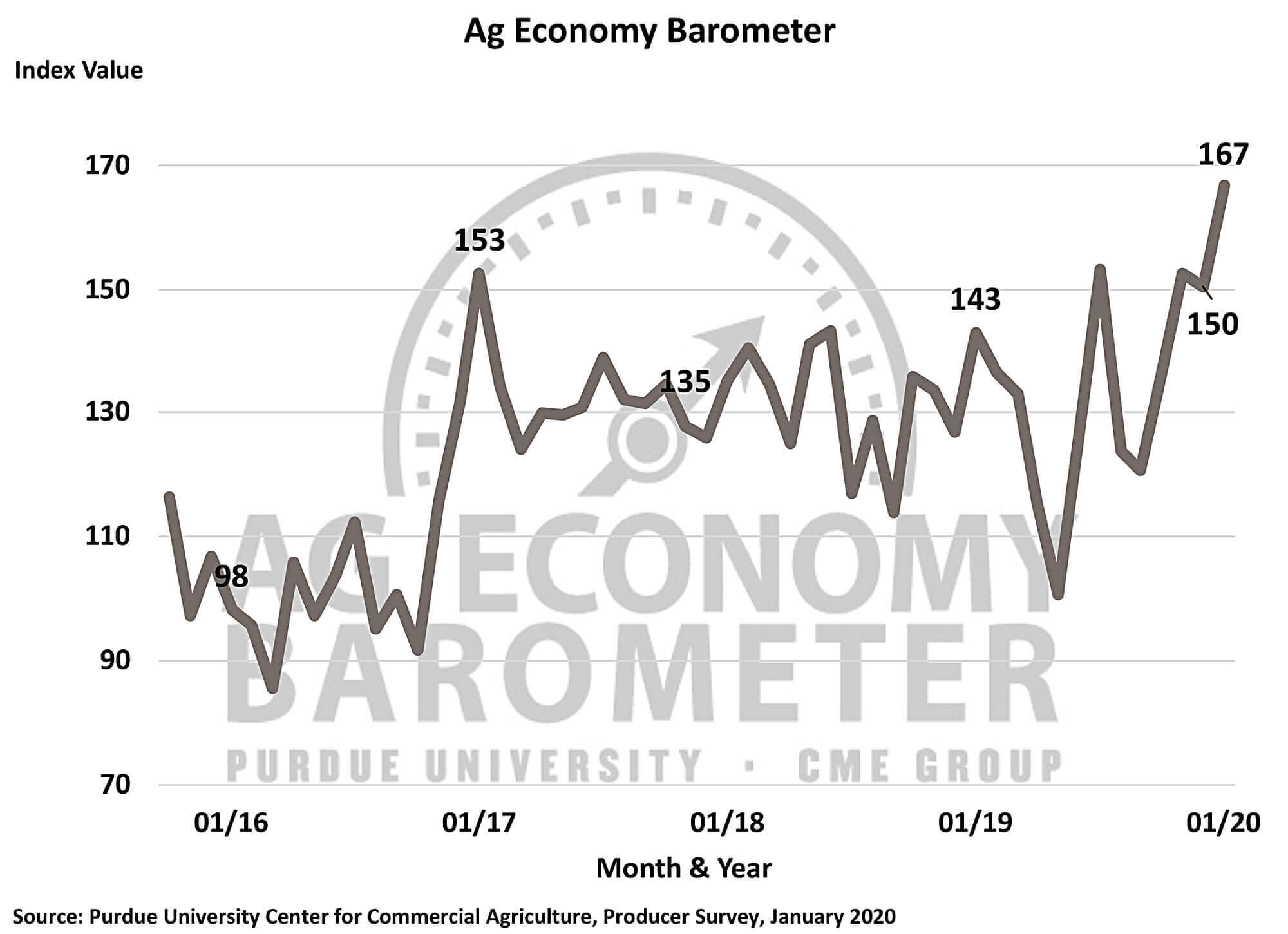 WEST LAFAYETTE, Ind. and CHICAGO – There was a sharp rise in agricultural producer sentiment in January as the Purdue University/CME Group Ag Economy Barometer rose 17 points from December to a reading of 167. Although the Index of Current Conditions was essentially unchanged, up one point to a reading of 142, the Index of Future Expectations jumped significantly, up 24 points since December to a reading of 179. The sentiment improvement took place as the Phase One Trade Agreement between the U.S. and China was being discussed and signed in mid-January. The Ag Economy Barometer is based on a mid-month survey of 400 U.S. agricultural producers and was conducted from January 13-17, 2020.