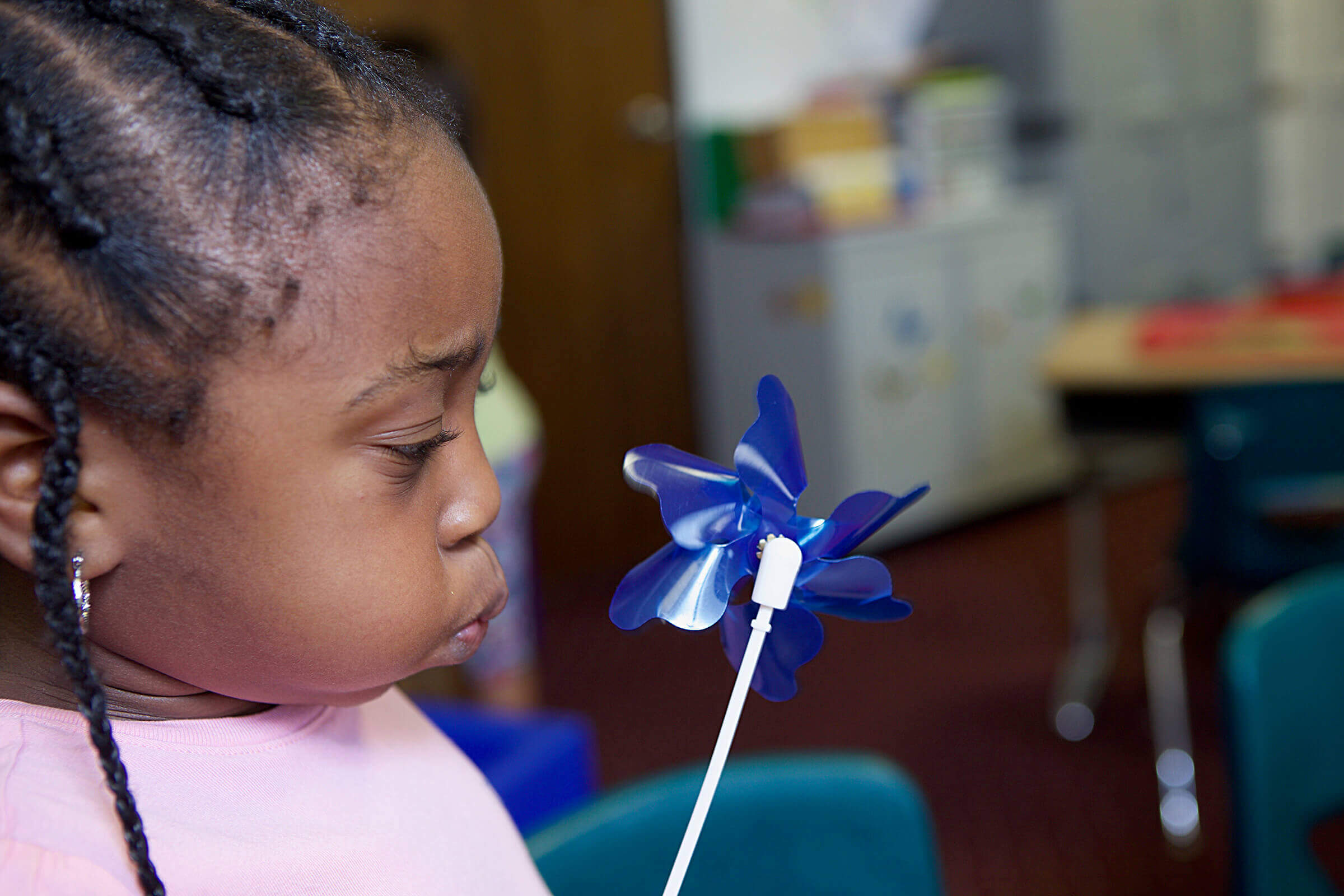 Child plays with toy in child care. (Purdue University photo by Tom Campbell